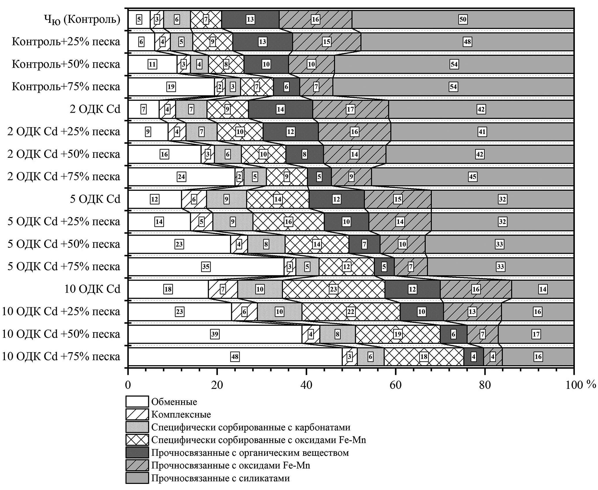 В загрязненном Cd черноземе обыкновенном тяжелосуглинистом изменения во фракционном составе металла приводят к изменению соотношения слагающих его соединений. Значительно увеличивается доля непрочносвязанных соединений Cd (до 58% от суммы фракций), в большей степени за счет обменных и специфически сорбированных форм Fe–Mn оксидами Cd (от 5 до 18% и от 7 до 23% от суммы фракций соответственно). Это приводит к изменению последовательности распределения металла по формам соединений. В вариантах с дозой внесения Cd, равной 10 ОДК, отмечается преобладание специфически сорбированных и обменных соединений во фракционном составе металла: специфически сорбированные с оксидами Fe–Mn > обменные > прочносвязанные с оксидами Fe–Mn > прочносвязанные с силикатами > прочносвязанные с органическим веществом > специфически сорбированные с карбонатами > комплексные.