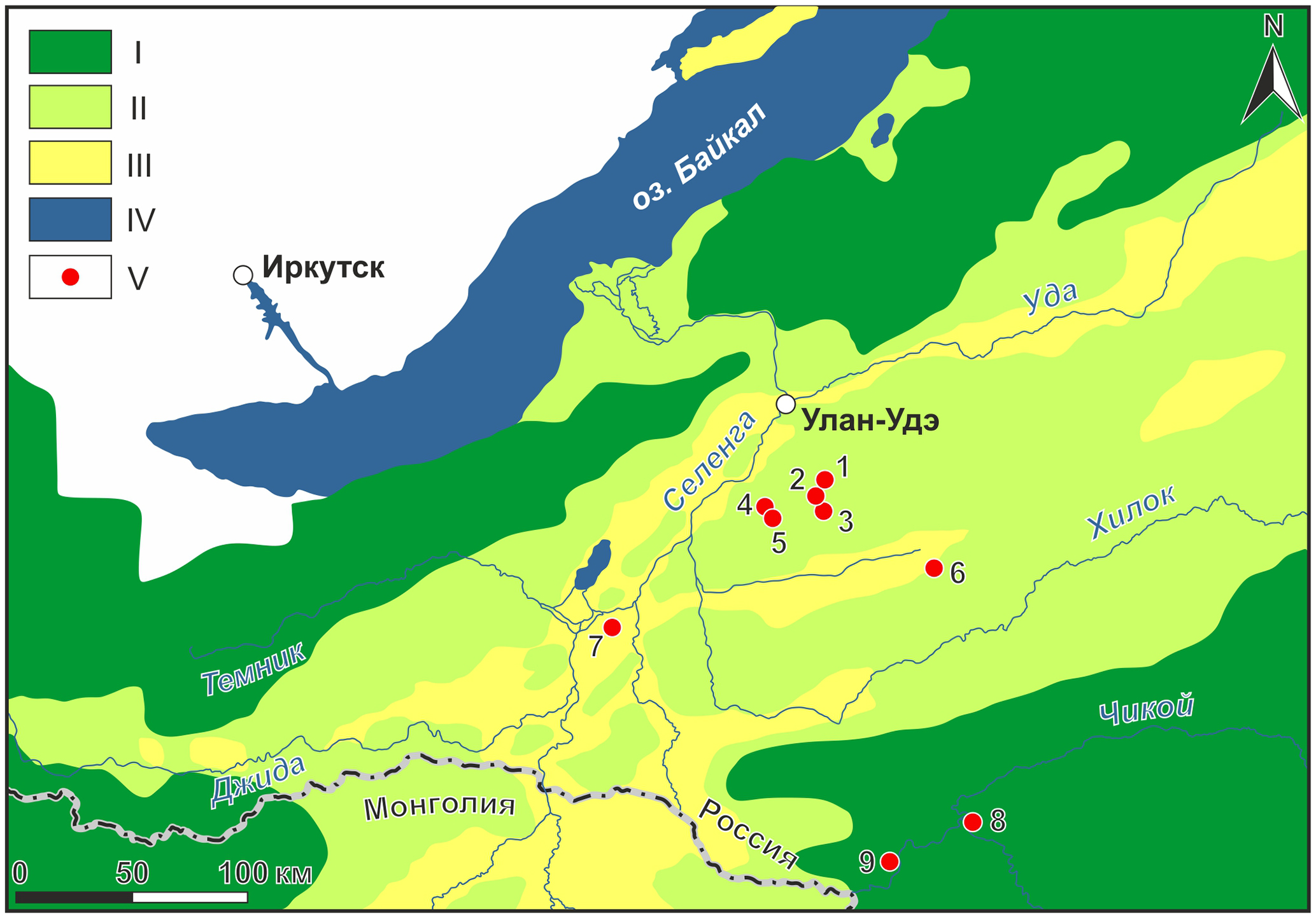 Рис. 1. Положение исследуемых почвенно-седиментационных серий в пределах Западного Забайкалья. I – тайга; II – лесостепь; III – степь; IV – водные объекты; V – разрезы (1 – Надеино; 2 – Нижняя Буланка; 3 – Большой Куналей-1; 4 – Тарбагатайка-1; 5 – Тарбагатайка-2; 6 – Никольск; 7 – Номохоново-1; 8 – Усть-Менза-1; 9 – Студеное-1).