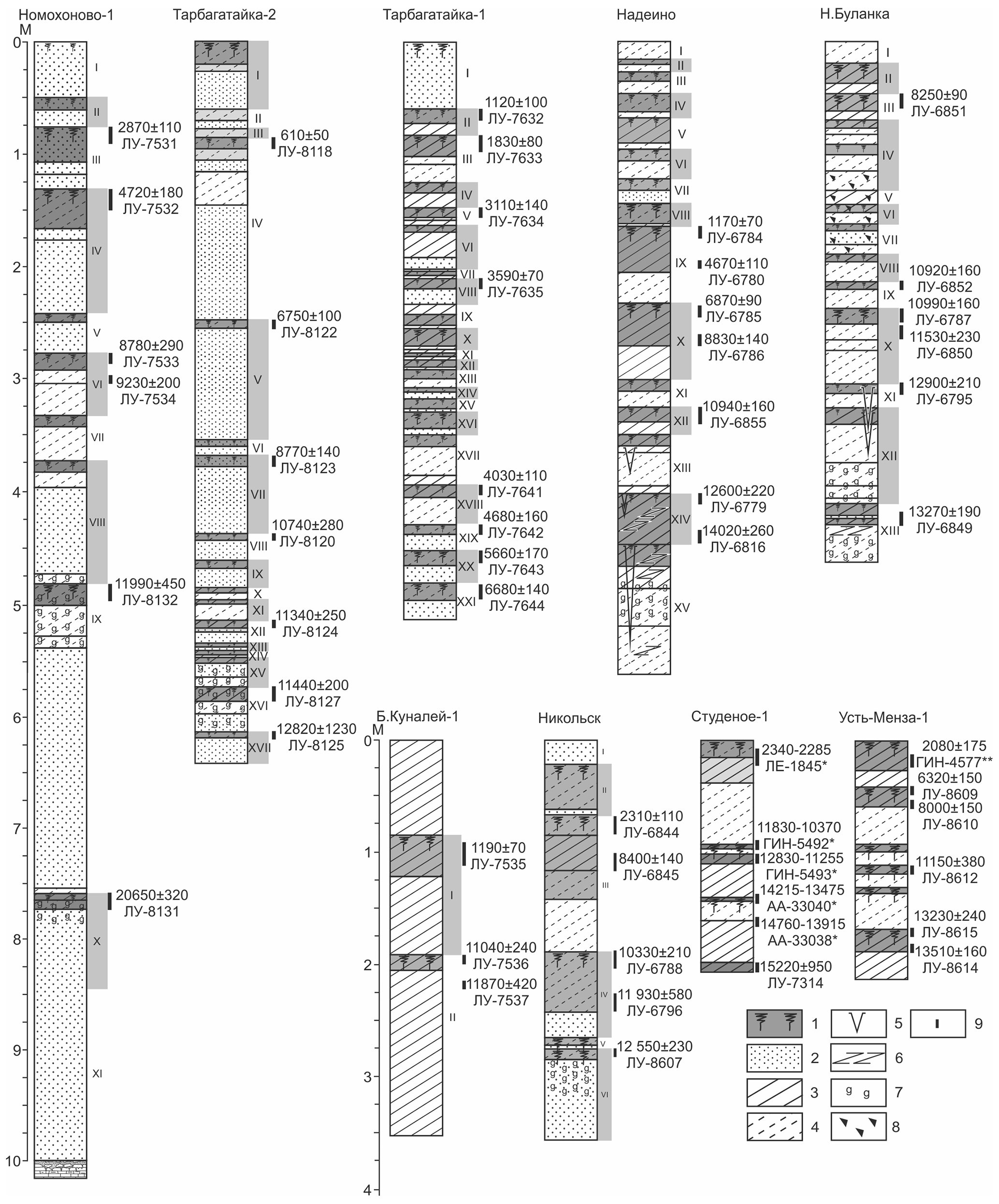 Рис. 2. Строение почвенно-седиментационных серий и возраст погребенных почв: 1 – гумусовые горизонты; 2 – пески; 3 – суглинки; 4 – супеси; 5 – криогенные клинья; 6 – криотурбации; 7 – признаки переменного окислительно-восстановительного режима; 8 – включения углей; 9 – места отбора образцов для проведения 14С-датирования и календарный возраст. * – согласно [49]; ** – согласно [26].