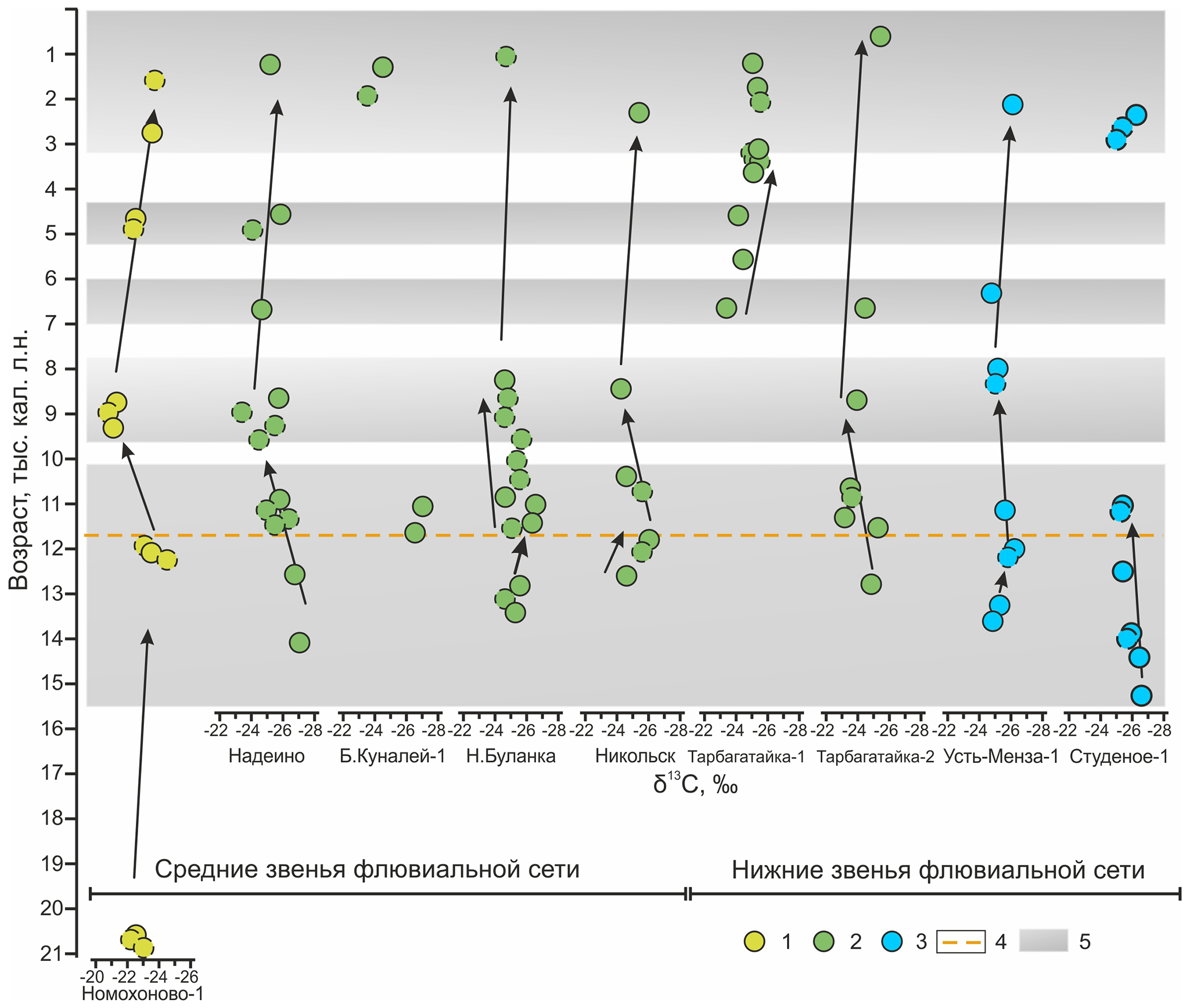 Рис. 3. Проявление периодов педогенеза в пределах различных звеньев флювиальной сети и вариации значений δ13C в разновозрастных почвах: 1 – степь; 2 – лесостепь; 3 – тайга; 4 – граница верхнего плейстоцена и голоцена; 5 – периоды почвообразования.