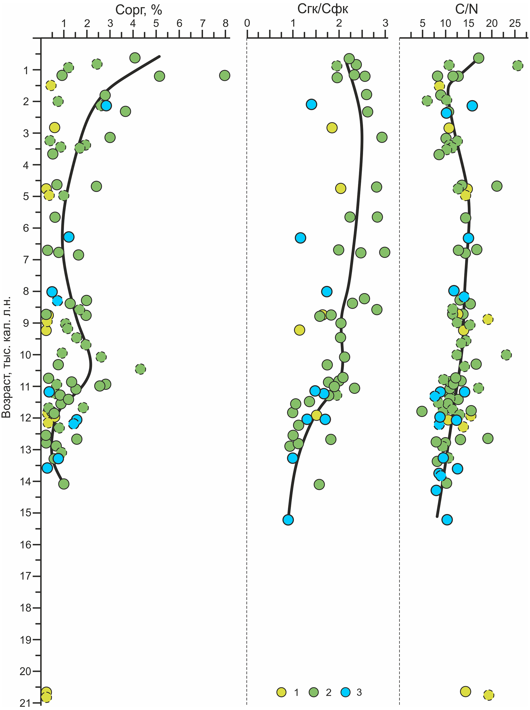 Наименьшим содержанием Сорг (менее 1%) характеризуются гумусовые горизонты почв в разрезах, ныне находящихся под степными ландшафтами. Для почв под лесостепями и тайгой отмечаются значительные колебания данного показателя (от 0.3 до 5.8%). Наименьшим содержанием органического углерода характеризуются почвы финально-плейстоценового времени (12.5–11.7 тыс. кал. л.н.) и среднего голоцена (7.5–5.0 тыс. кал. л.н.). Относительные пики данного показателя фиксируются в раннеголоценовых почвах и почвах возрастом 14.0–14.5 тыс. кал. л.н. (рис. 4).
