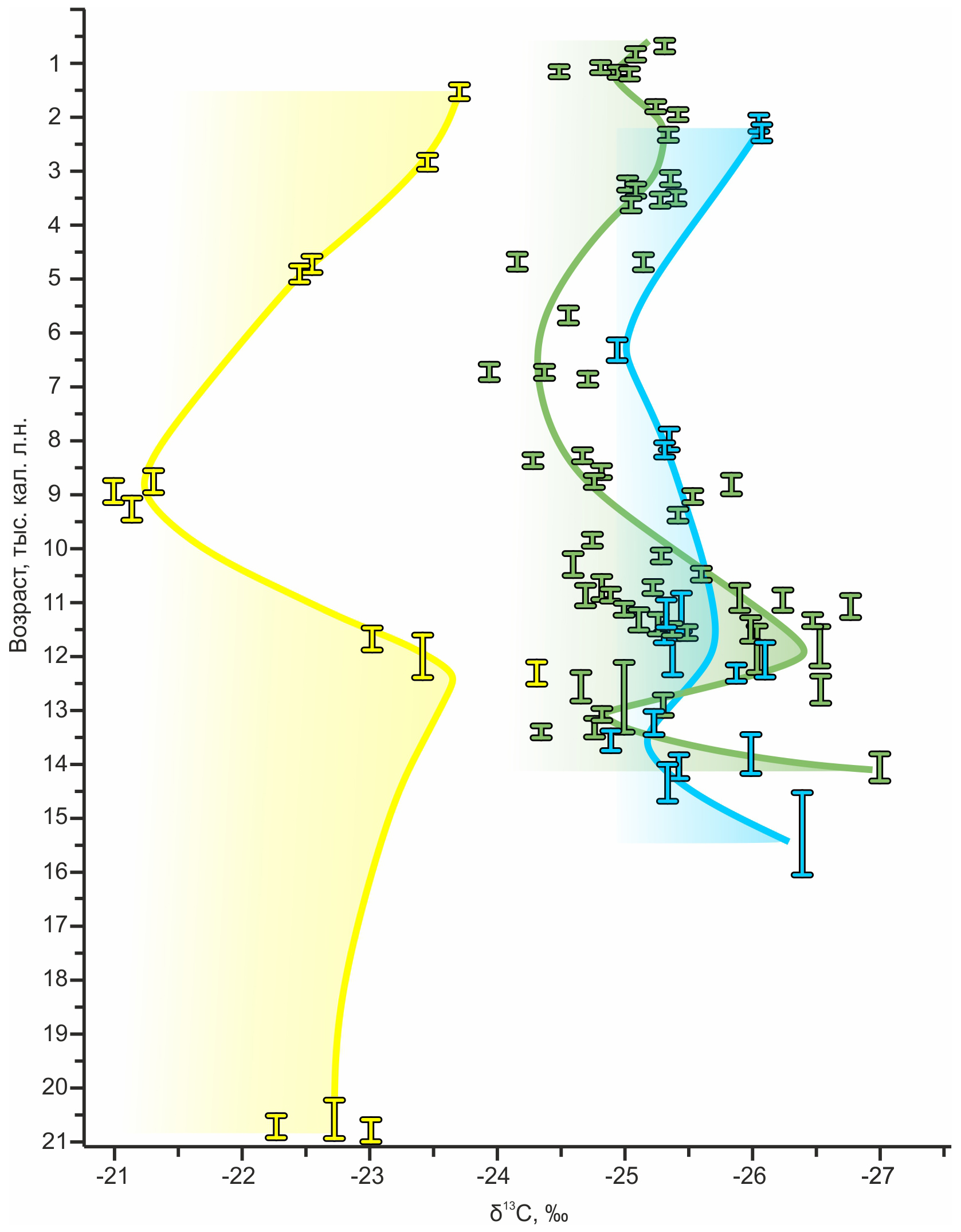 При этом динамика временных изменении значений δ13С в лесостепных условиях может служить индикатором периодов, когда этот экотон приобретал более таежные черты (позднеледниковье (около 14.0 тыс. кал. л.н.), ранний и поздний голоцен), а когда остепнялся (финальные стадии позднего плейстоцена и средний голоцен). Данные изменения в составе стабильных изотопов углерода хорошо укладываются в контекст региональных ландшафтно-климатических изменений.