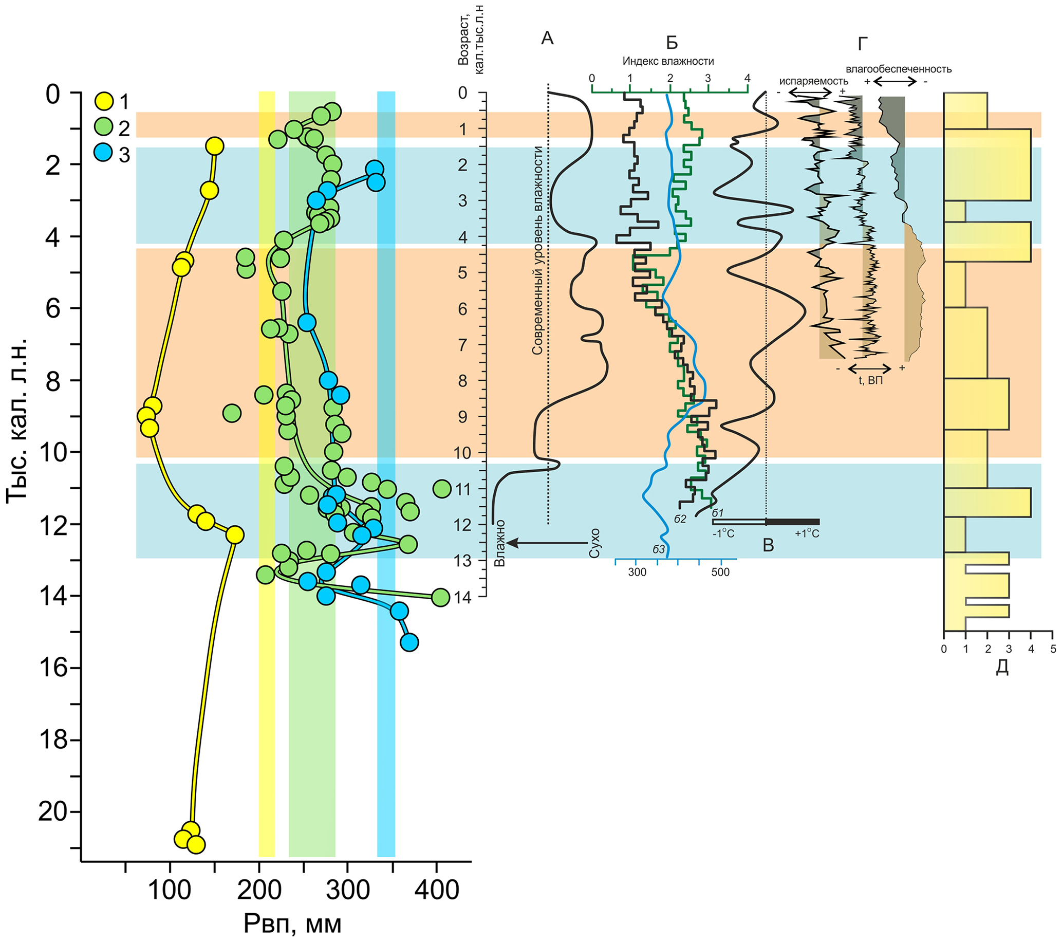 Рис. 6. Реконструированные значения сумм осадков вегетационного периода в течение последних 15 тыс. лет и их сопоставление с региональными палеоклиматическими данными. А – уровень увлажнения, реконструированный по данным изучения колебаний озер севера Монголии [60]; Б – динамика увлажнения на севере Монголии (б1) [72] и в Байкальском регионе (б2 [72], б3 [70]); В – реконструкция температур в Байкальском регионе [7]; Г – динамика увлажнения и изменения температур вегетационного периода [35]; Д – интенсивность педогенеза [11]. 1 – степь; 2 – лесостепь; 3 – тайга. Вертикальные прямоугольники желтого, зеленого и голубого цветов указывают на современные суммы осадков вегетационного периода в степных, лесостепных и таежных ландшафтах исследуемой территории, соответственно.
