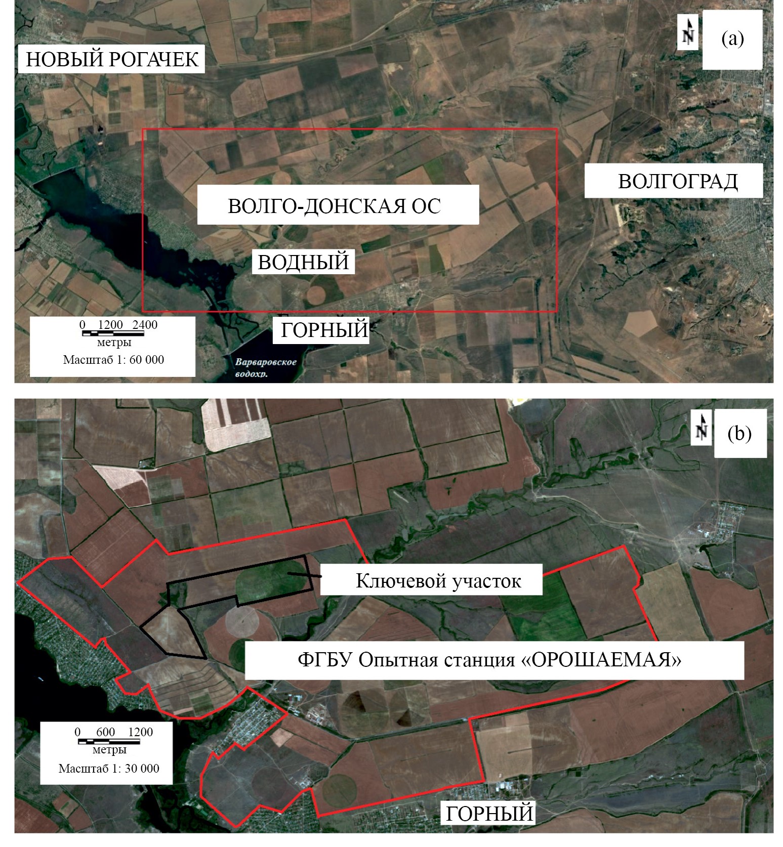 Рис. 1. Расположение Волго-Донской ОС, отображенное на космическом снимке с портала Google Earth (Pleiades, 25.05.2021) (a); территория ФГБУ “Опытная станция “Орошаемая” и ключевой участок исследований на космическом снимке (Sentinel-2, 28.06.2020) (b)