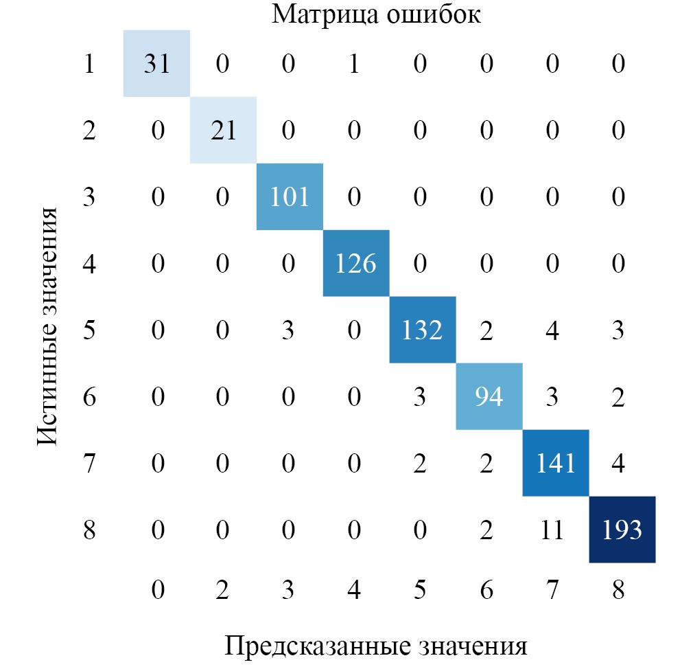 Рис. 2. Матрица ошибок классифицированного изображения почв (8 классов) по космическому снимку высокого разрешения Pleiades, 25.04.2020, в пикселах (контрольная выборка)