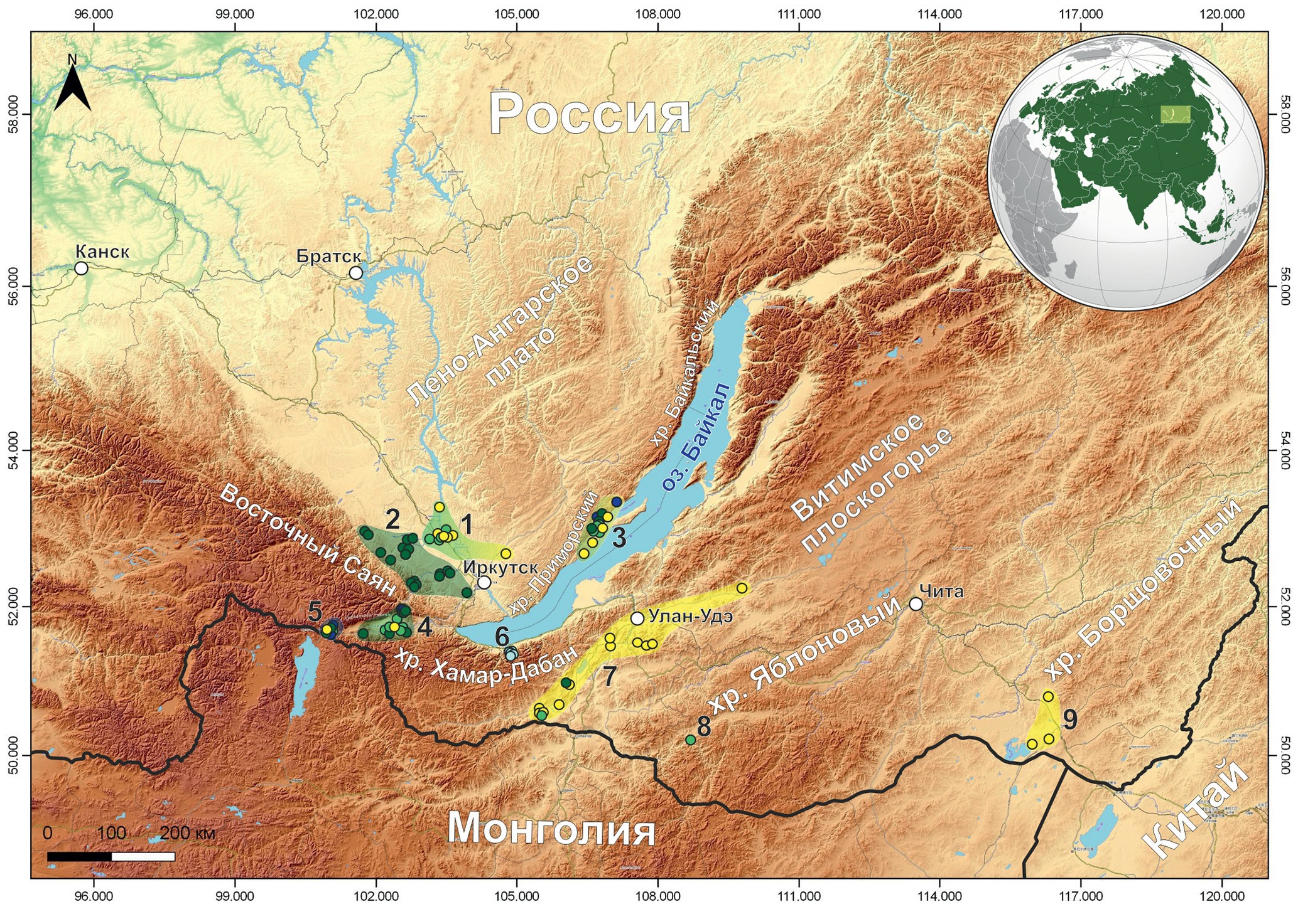 Географическое положение и орография исследуемого региона. Байкальский регион (рис. 1) представляет собой обширную область на юге Восточной Сибири, характеризующуюся значительным разнообразием физико-географических условий [20]. Западная часть территории (Предбайкалье) приурочена к Сибирской платформе и ее краевым частям. В орографическом отношении данная территория представлена предгорными равнинами Восточных Саян, межгорными котловинами с преобладанием холмисто-увалистого рельефа и абсолютными высотами 200–500 м [24]. Территория расчленена глубоковрезанными речными долинами. Центральная часть территории (Саяно-Байкальское становое нагорье) характеризуется обширными высокогорными плато и горными хребтами с абсолютными высотами до 2300–3000 м и более, разделенными глубокими впадинами [21]. Восточная часть (Забайкалье) относится к области древней складчатости, ныне характеризующейся среднегорным, плоскогорным, а на юго-востоке – равнинным рельефом. Абсолютные высоты колеблются от 500–700 до 800–1200 м. Преобладают межгорные котловины северо-восточного простирания с увалисто-полого-равнинным рельефом. Горные хребты вытянуты с северо-востока на юго-запад, имеют плоские вершины с абсолютными высотами 1000–1500 м [21].