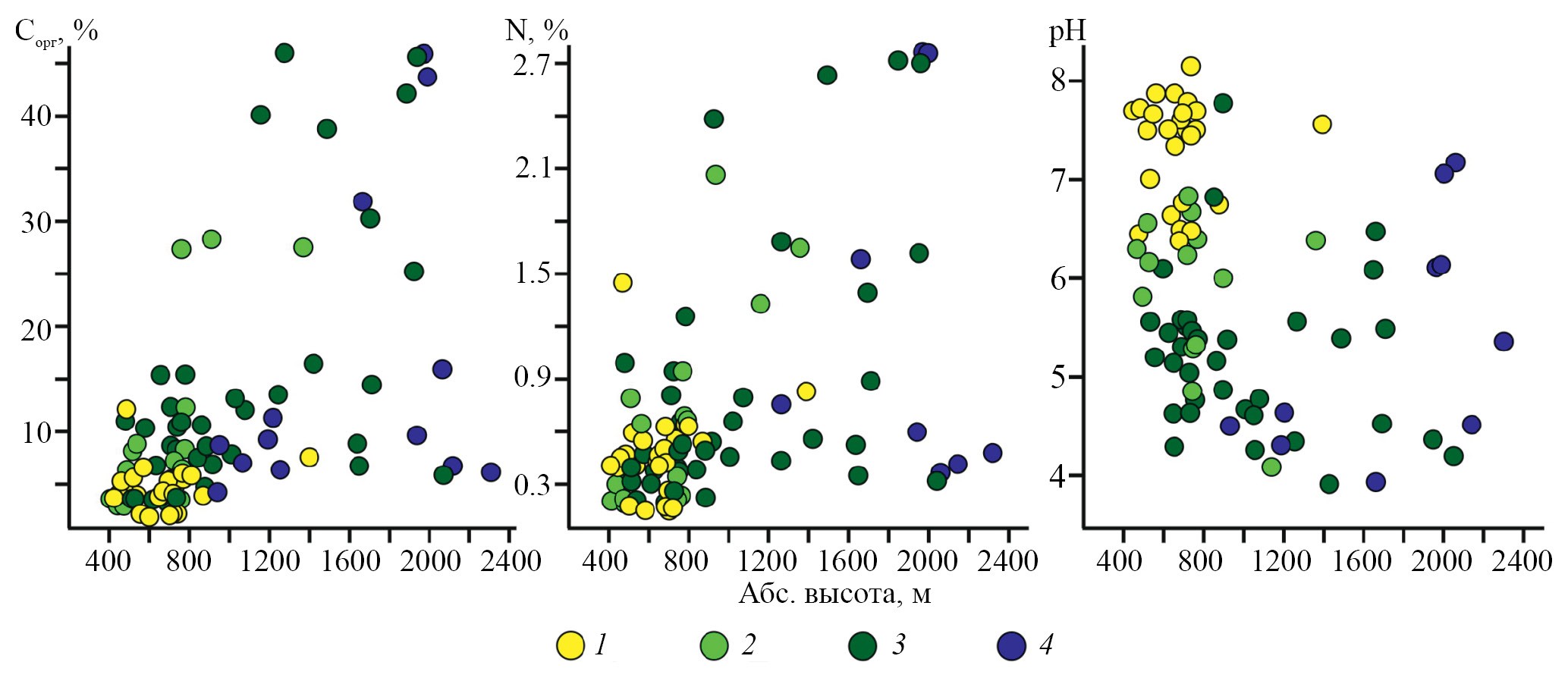 4. Fig. 3. Variations in the content of organic carbon, total nitrogen and pH depending on the change in absolute altitudes in the upper humus horizons of the studied soils: 1 - steppe; 2 - subtaiga; 3 - mountain taiga; 4 - mountain and subgoltz landscapes