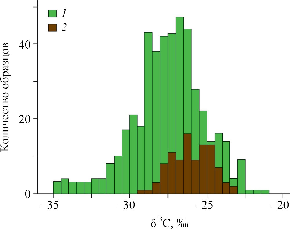 Рис. 4. Гистограмма значений δ13C современных почв Байкальского региона (1) в сравнении с диапазоном значений δ13C С3-растений (2) [56]