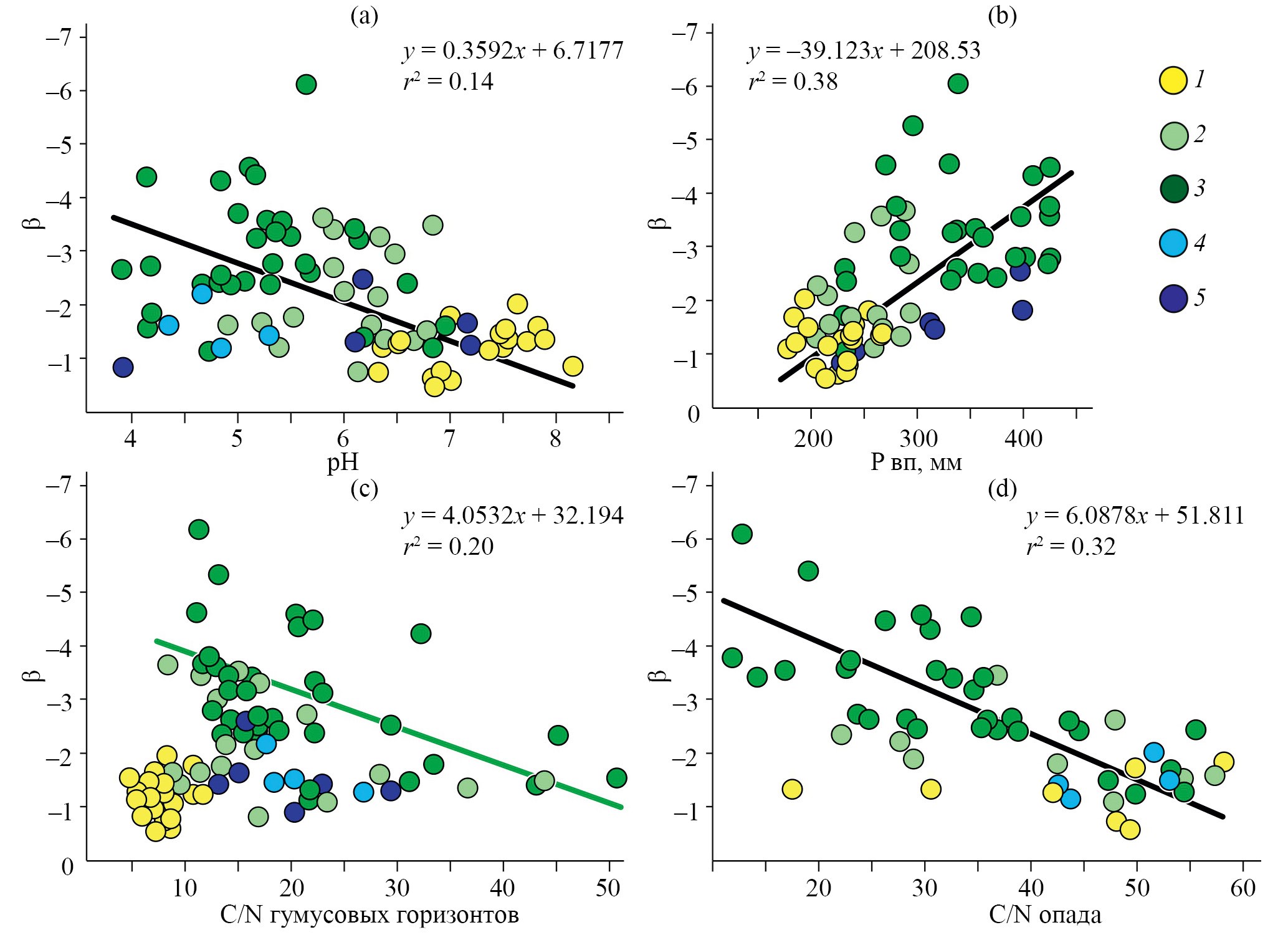 Рис. 6. Зависимости коэффициентов линейной регрессии β (δ13C/lg (г C/кг)) от вариаций pH (а), суммы осадков за вегетационный период (b) и отношения C/N в поверхностных гумусовых горизонтах (c) и опаде (d). 1 – степь; 2 – подтайга; 3 – горная тайга; 4 – субальпийские луга; 5 – гольцы
