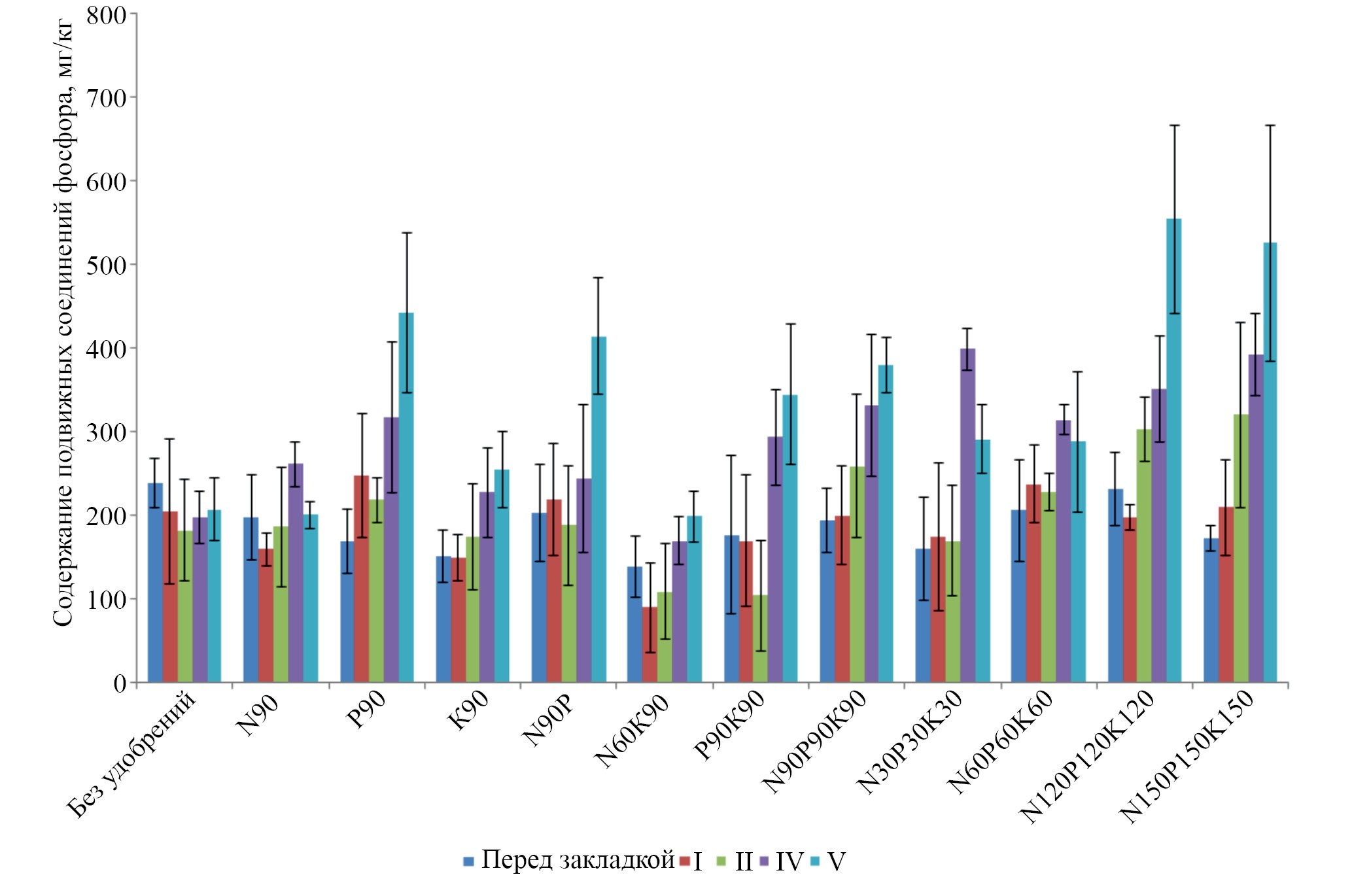 Рис. 1. Изменение содержания подвижных соединений фосфора в дерново-подзолистой почве (0–20 см) при длительном применении различных видов, доз и соотношений минеральных удобрений (I–V ротации, 1978–2019 гг.), мг/кг (“усы” на графике – доверительный интервал, р < 0.05)
