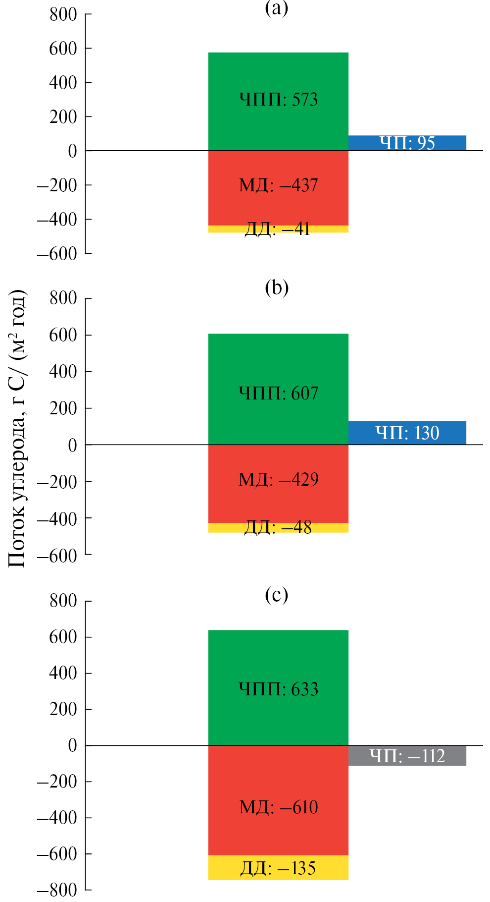 Рис. 1. Расчет экосистемного нетто-потока (ЧП) в трех типах леса по чистой первичной продукции (ЧПП), микробному дыханию в почве (МД) и дыханию валежа и сухостоя (ДД). Положительные значения обозначают поглощение С экосистемой из атмосферы, отрицательные – источник С в атмосферу. (а) – старовозрастный дубовый лес, (b) – кленово-дубовый лес, (c) – ясеневый лес.