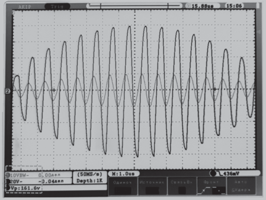 Описаны усилители сигнала раскачки пьезоизлучателей аппаратного обеспечения гидроакустичес-кого исследовательского комплекса, предназначенные для усиления кратковременных сигналов с амплитудной, частотной и фазовой модуляцией на частоте 1 МГц. Особенностью линейного усилителя сигналов с амплитудной модуляцией является применение усилителя с токовой обратной связью, характеризующегося высокими скоростными свойствами. Особенность ключевого усилителя сигналов с постоянной амплитудой (частотная и фазовая модуляция) – это применение оптопар в схеме формирователя управляющих импульсов выходных MOSFET (metal-oxide-semiconductor field effect transistor), что обеспечило симметрию импульсов. Высокая скважность усиливаемых сигналов позволила избежать необходимости в специальных теплоотводах и выполнить простую и компактную реализацию схем. Коэффициент усиления линейного усилителя составил 18 дБ, максимальная амплитуда выходного сигнала – 80 В, ключевого – 26 дБ и 200 В соответственно. Приведены конкретные схемотехнические решения.