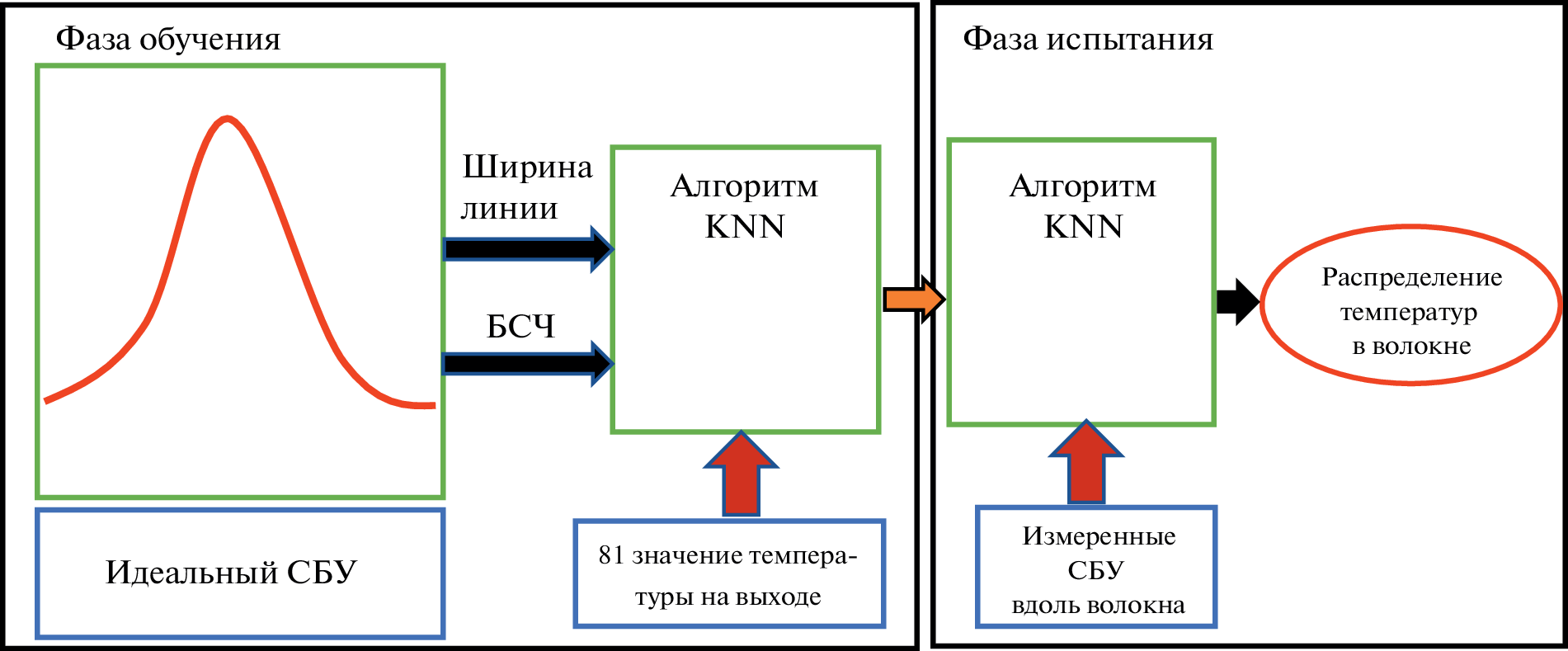 The authors propose to use the K-nearest neighbor (K-NN) algorithm to process the probe signals from the previously proposed Brillouin optical time-domain reflectometry (BOTDR) fiber sensor called the differential cross-spectrum BOTDR (DCS-BOTDR), which features a high spatial resolution. Widening of the Brillouin gain spectrum (BGS) when the pulse duration TL is set shorter than the phonon lifetime (~10 ns) is a key problem associated with the DCS-BOTDR. Although the spectrum distortion is reduced also, deterioration in the Brillouin frequency shift (BFS) resolution is observed, which is caused by the broadening of the Brillouin spectrum. On the other hand, while the TL duration exceeding the steady state of the Brillouin signal narrows the spectrum, sidelobes are produced within the steady-state range, which result in the deterioration of the BFS resolution. This limitation is observed only in the DCS-BOTDR, although it is capable of measuring with a high spatial resolution. The experimental data obtained for a fiber with a length of ~400 m and with optimized TL duration in the temperature range of 40–80°C were used in our model to extract the Brillouin temperature coefficient CT. Ideal BGSs were then constructed in the training phase by simulation with different linewidths of 50–70 MHz in order to train the K-NN model with due account for the linewidth variation caused by the difference in the conditions between the training and testing phases. The model was thereby made flexible for various fiber conditions. Experimental data for the sensing of a ~3.6-km-long fiber with TL = 60 ns were used in the testing phase to obtain the temperature distribution. By employing K-NN, the accuracy in determining the temperature for TL = 60 ns has been improved to approximately 2.77°C. Therefore, the K-NN model can be an excellent alternative tool for processing BGSs measured by the DCS-BOTDR and obtaining the temperature distribution along the fiber.
