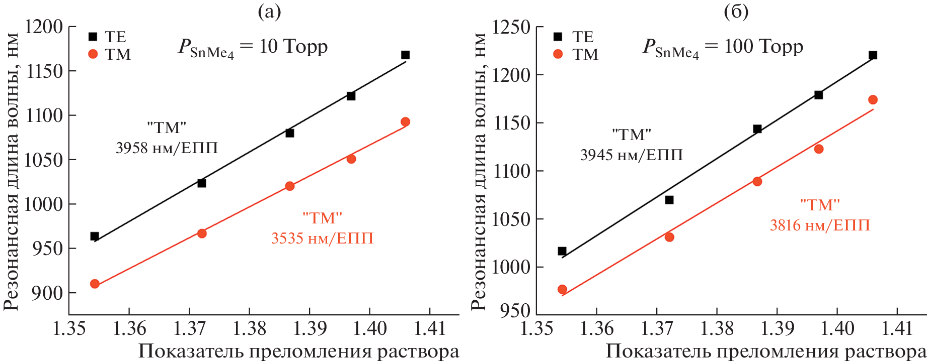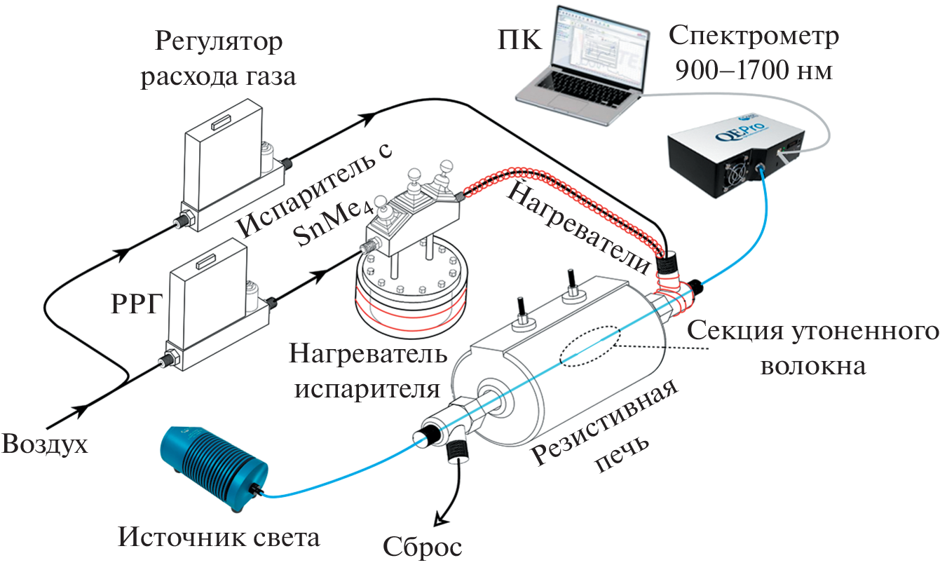 Thin-film coatings of tin oxide on the surface of a chemically thinned section of a single-mode quartz fiber have been obtained and experimentally characterized. The materials were synthesized on the fiber surface by metal-organic chemical vapor deposition (MOCVD). To change the surface morphology, we used different amounts of tetramethyltin (SnMe4) supplied by a carrier gas (dried air) to the deposition zone by varying the temperature of the bubbler with the reagent. During deposition, the transmission spectrum of the optical path was recorded in real time, and the temperature of the bubbler in the experiments varied from –20 to +20°С. After studying the surface on a scanning electron microscope, the deposited films were tested for chemical resistance to an aqueous solution of sulfuric acid and the sensitivity of the lossy mode resonance (LMR) to changes in the refractive index of the environment in the range from 1.35 to 1.41 was evaluated. Samples produced at higher reagent flow rates exhibited a greater resonance sensitivity of 3800 nm/refractive index unit (RIU) for the first-order TM component of the resonance, but such coatings dissolve noticeably in concentrated sulfuric acid solutions, in contrast to coatings obtained with low reagent consumption.