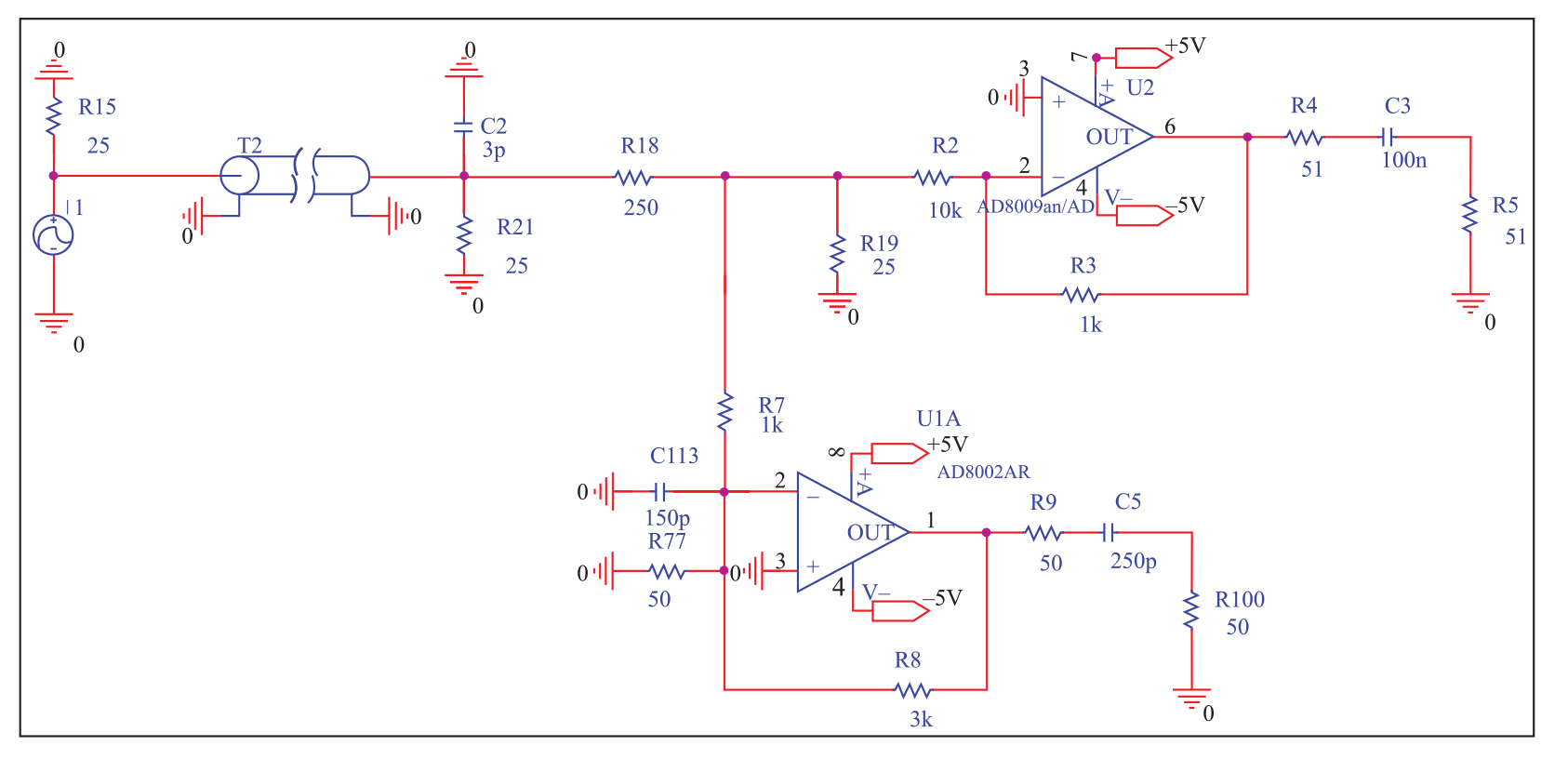На рис. 4 изображена PSPICE-модель формирователя синусного импульса, выполненного на быстром операционном усилителе ИС U1 AD8002 с полосой частот единичного усиления 600 МГц и трансимпедансным значением 50 Ом по инвертирующему входу. Такое построение схемы обеспечивает введение 100% отрицательной обратной связи для удобства формирования передаточной характеристики в расчетном диапазоне длительностей импульсов по основанию от 12 до 30 нс PSPICE. Модель также содержит референсный канал на ИС U2 (AD8009), предназначенный для привязки коэффициента преобразования к другим частям канала считывания. Принципиальная электрическая схема формирователя синусного импульса построена на основе генератора гармонических колебаний на ИС U1 с времязадающей цепочкой C113R77. При этом длительность формируемого синусного импульса также зависит от переходной характеристики самого операционного усилителя U1 AD8002, охваченного отрицательной обратной связью через резистор R8.