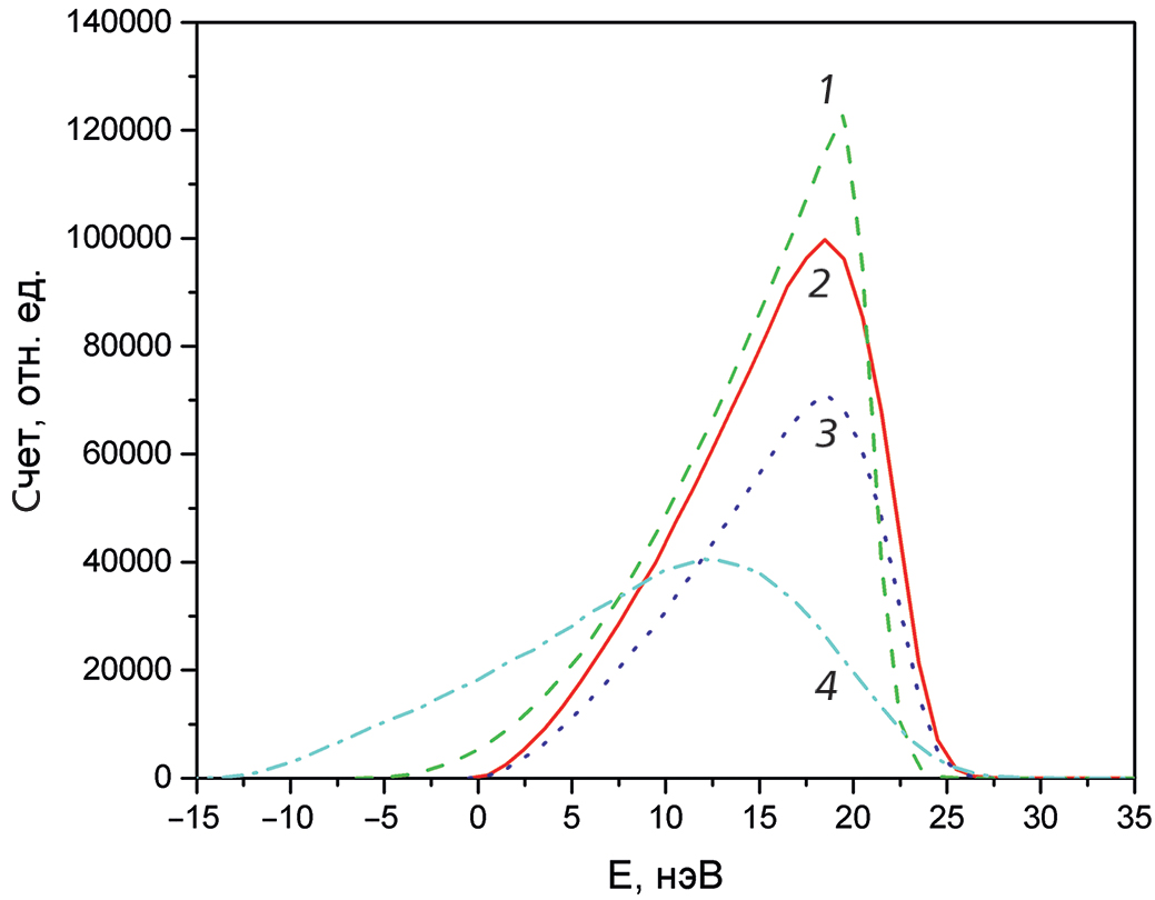 Рис. 3. Спектр УХН в различные моменты времени: 1 – 650 c, 2 – 700 с, 3 – 1000 с, 4 – при регистрации на детекторе. Отсчет энергии ведется от дна ловушки в горизонтальном положении (θtrap = 0).