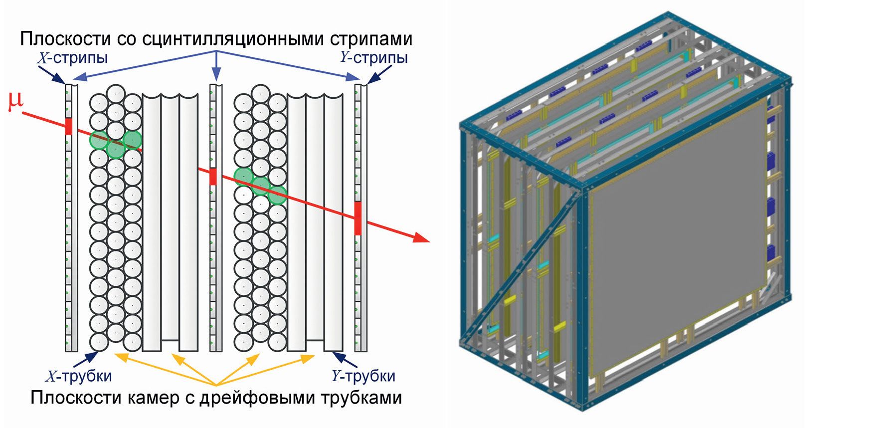 Каждая из шести однопроекционных координатных плоскостей сцинтилляционного стрипового детектора состоит из 128 длинных узких сцинтилляционных стрипов (3000 × 23 × 7 мм3) с оптоволоконным (WLS) светосбором на кремниевые фотоумножители (SiPM). Однопроекционные регистрирующие плоскости детектора на дрейфовых трубках (ДДТ) представляют собой трехслойные сборки дрейфовых трубок длиной 3000 мм и диаметром 30 мм, разработка и производство которых осуществлялись в НИЦ “КИ”-ИФВЭ (г. Протвино). Каждый детектор имеет свои преимущества: стриповый детектор обладает высоким быстродействием, формирует триггер и начальное положение трека, а детектор на дрейфовых трубках обладает высоким координатным разрешением и дает возможность формировать мюонограммы с разрешением, уступающим только ядерным эмульсиям.