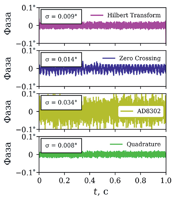Из рисунка также следует, что три из четырех методов извлечения фазы сигнала дают близкие результаты. Заметно отличается только результат, полученный при измерениях с помощью квадратурного детектора. Это различие обусловлено систематической ошибкой последнего, рассмотренной в предыдущем разделе.