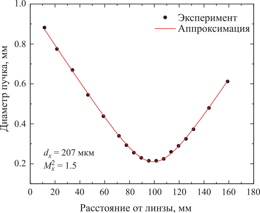 Использование аттенюатора, состоящего из полуволновой пластинки (λ/2) и поляризатора (Pol), позволяет плавно изменять уровень мощности и энергии излучения при неизменных пространственных параметрах луча и длительности импульсов лазера. Импульсы фокусировались в образец при помощи линзы с фокусным расстоянием f = 100 мм. При помощи метода ножа Фуко была измерена каустика пучка вдоль направления распространения излучения (рис. 2). Согласно стандарту для определения качества пучка, ISO 11146-1/2, результаты измерений диаметра пучка в различных сечениях вдоль трассы его распространения аппроксимируются гиперболической зависимостью. Исходя из полученных коэффициентов, можно вычислить расходимость, диаметр перетяжки и параметр М 2. Радиус пучка в перетяжке составил ω0 ≈ 103.5 мкм, длина Рэлея zR = 21.4 мм, а М 2 = 1.4.