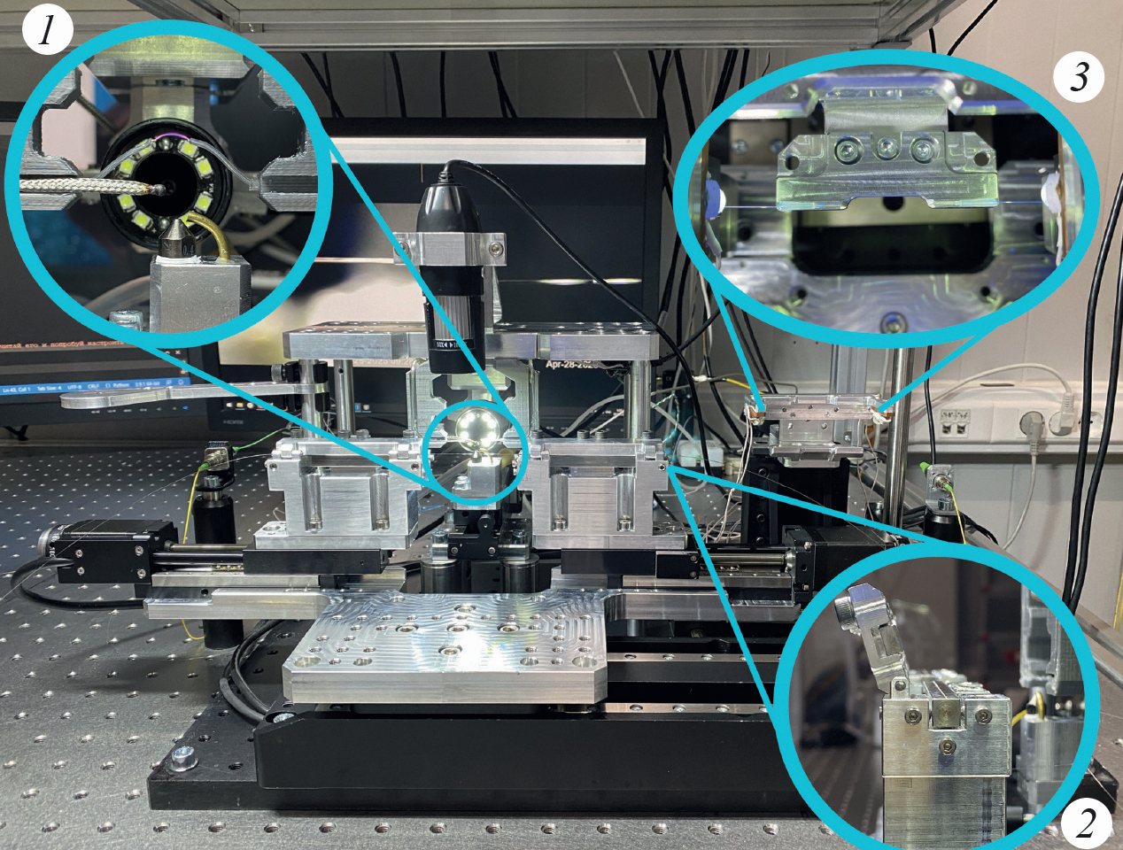 Рис. 2. Внешний вид экспериментальной установки: 1 – увеличенное изображение системы высокочастотного поджига и тушения пламени сжатым воздухом, контроль процесса горения осуществляется при помощи термопары; 2 – внешний вид системы фиксации волокна в направляющей с регулировкой по 4 степеням свободы; 3 – увеличенное изображение системы полимеризации клея на изготовленном волокне, закрепленном на вилке.