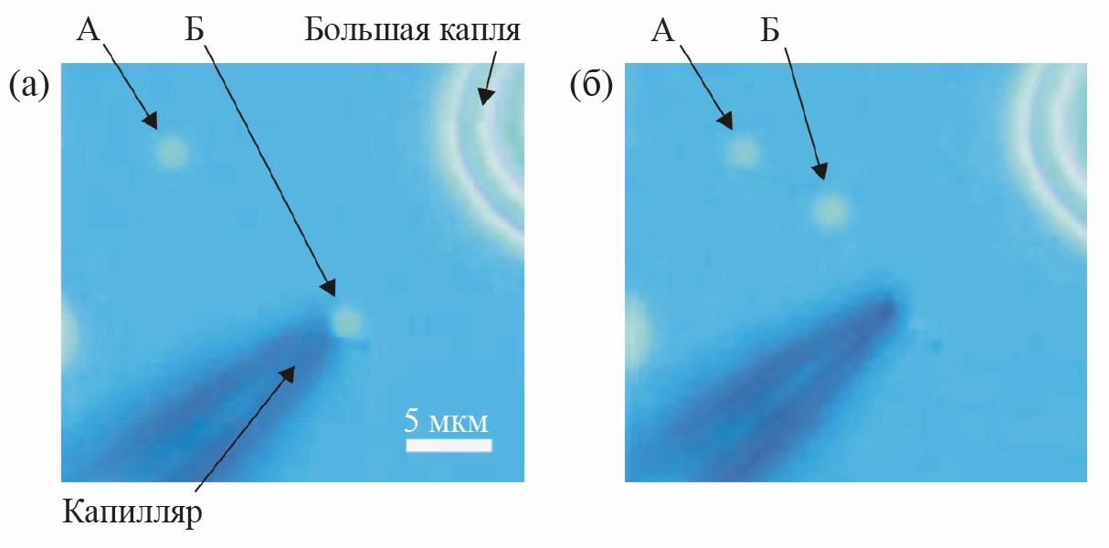Рис. 8. Пример создания и перемещения капель жидкости (капли А и Б отмечены стрелками) по поверхности подложки. Масштабы изображений на обоих рисунках совпадают.