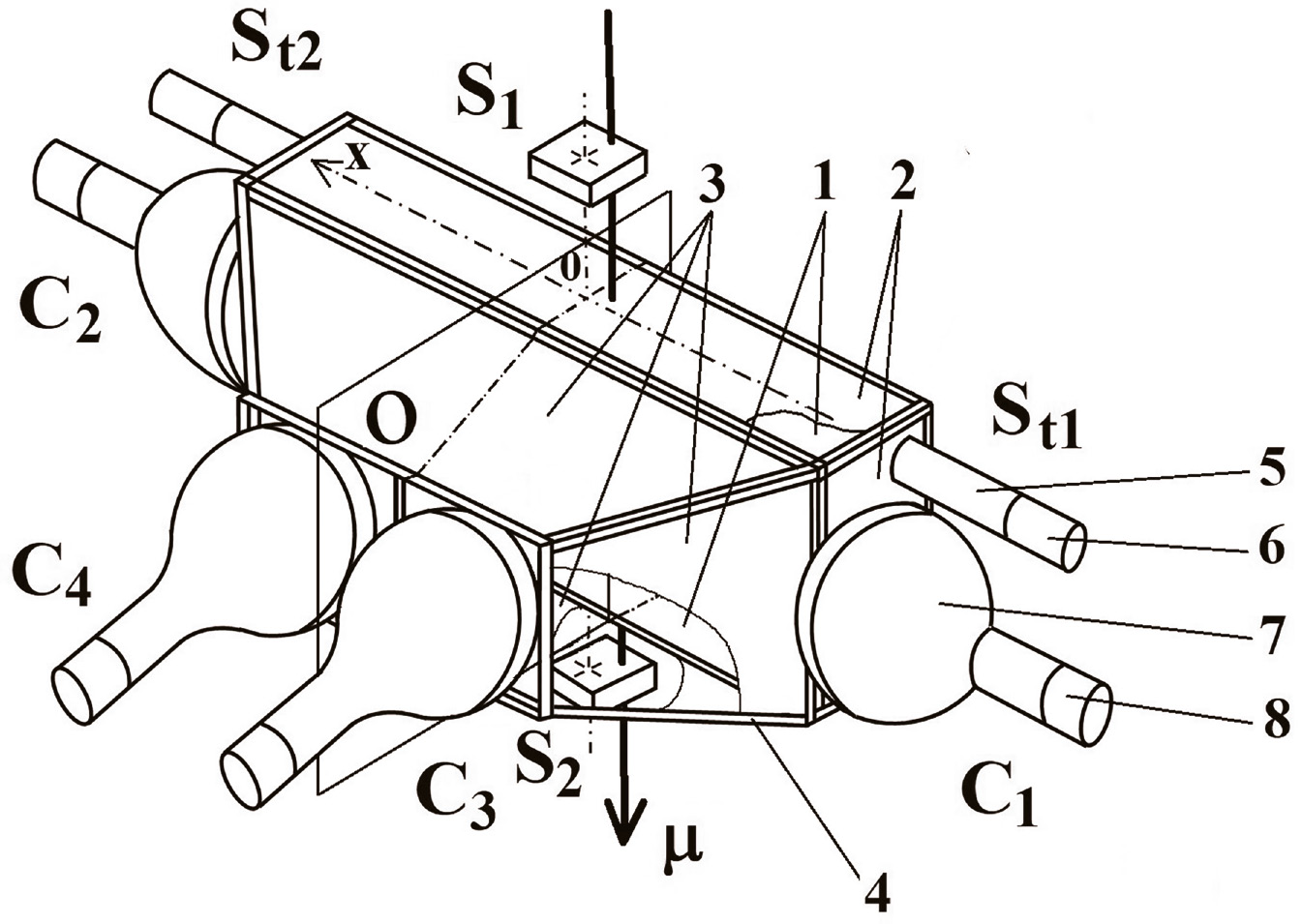 САКС состоит из амплитудной и координатной систем. Амплитудная система включает четыре фотоэлектронных умножителя ФЭУ-49, просматривающих сцинтилляционный блок с двух противоположных граней размером 145×235 мм2 (“горизонтальные” C1 и C2) и с верхней грани размером 510×235 мм2 (“вертикальные” C3 и C4). Горизонтальные ФЭУ непосредственно без смазки плотно прижаты к граням блока, вертикальные расположены в 16 см от верхней грани блока симметрично плоскости O, проходящей через центр симметрии блока и разделяющей блок на два равных по объему меньших блока размерами 145×255×235 мм3 (рис. 1). В качестве отражателя света использована бумага для копирования 2, исключая верхнюю грань спектрометра и части боковых граней, занятых фотокатодами ФЭУ-49 и ФЭУ-85 (5 и 7). В качестве боковых отражателей для сбора света с верхней грани использована фольга 3. Все ФЭУ-49 отобраны по коэффициентам усиления и минимальному относительному амплитудному разрешению.