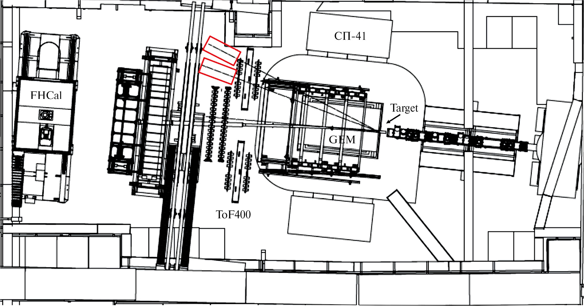 Идентификация частиц осуществляется путем измерения времени пролета с помощью времяпролетных детекторов TOF-400 и TOF-700, размещенных на расстоянии 4 м и 7 м от мишени соответственно. Они состоят из многозазорных резистивных плоских камер (МRPC) со стриповым считыванием и обеспечивают временное разрешение 80 пс для TOF-400 и 115 пс для TOF-700. Эти детекторные системы позволяют идентифицировать адроны (π, K, p), а также легкие ядра с импульсом до нескольких ГэВ/с, образующиеся при столкновениях ядер с мишенью. Трековая система состоит из трех плоскостей двухкоординатных кремниевых детекторов (STS), семи трековых станций на основе трехзазорных камер газового электронного умножения (GEM), установленных в магните, и двух катодно-дрейфовых камер (CDC), расположенных за магнитом. Система STS + GEM позволяет измерять импульсы заряженных частиц с относительной ошибкой от 2.5% для импульса 0.5 ГэВ/с до 4.5% для импульса 3.5 ГэВ/с. Эта система также обеспечивает измерения множественности рождающихся заряженных частиц, которую можно использовать в качестве дополнительной оценки центральности столкновения. Для измерения центральности и ориентации плоскости реакции при ядерно-ядерном столкновении используется передний адронный калориметр (FHCal) вместе с передним кварцевым годоскопом (FQH) и многоканальной сцинтилляционной стенкой (ScWall), последняя также используется для измерения заряженных фрагментов-спектаторов. Также установка содержит пучковые и триггерные детекторы, показанные на рис. 2.