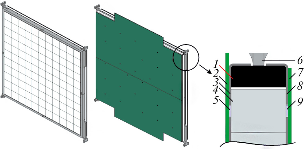 Рис. 4. Схематическое изображение сборки сцинтилляционного слоя детектора HGND. Слева: расположение 121 ячейки в корпусе сборки. В центре: сборка с двумя печатными платами, прикрепленными к матрице сцинтилляторов. Справа: вид в поперечном разрезе полностью собранной сборки с печатными платами: 1 — каркас корпуса; 2 — одна из двух плат с 55 или 66 SiPM (5); 3 и 8 — алюминиевые пластины обеих сторон каркасного корпуса с отверстиями для фотодиодов и светодиодов; 4 — сцинтиллятор; 5 — фотодиод; 6 — кронштейн опоры сборки; 7 — плата светодиодов; 9 — светодиод.