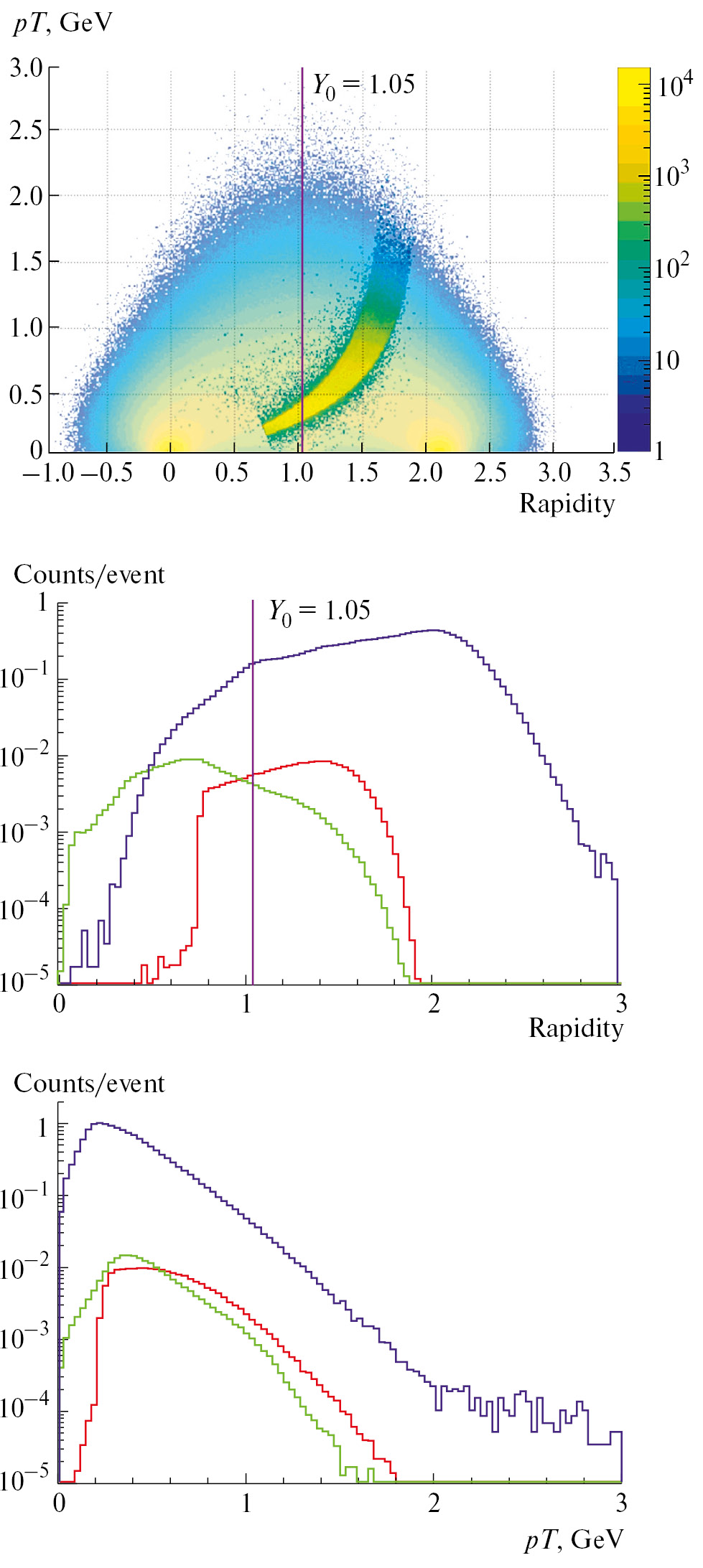 Рис. 7. Сверху: график зависимости поперечного импульса от быстроты. Вставка соответствует аксептансу детектора HGND под углом 17° для первичных нейтронов с отбором по времени менее 25 нс. Распределения по быстроте и поперечному импульсу для первичных (красный цвет) и фоновых (зеленый цвет) нейтронов показаны на центральном и нижнем рисунках соответственно. Вертикальная линия на распределении по быстроте соответствует средней быстроте y0 = 1.05 для данной реакции. Синими кривыми показаны соответствующие распределения протонов, измеренные спектрометром BM@N.