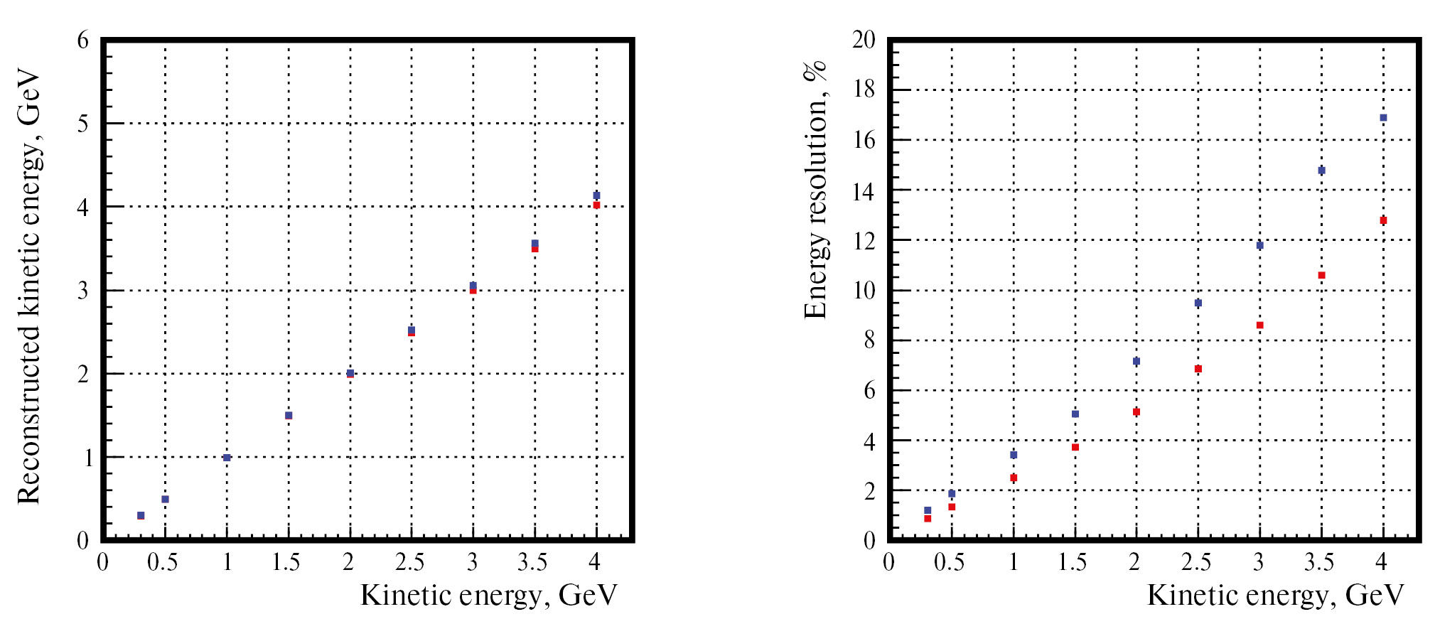 Зависимость восстановленной энергии нейтрона и энергетического разрешения от энергии первичного нейтрона представлена на рис. 12. Результаты показаны для двух случаев временного разрешения ячеек: 100 пс (красный) и 150 пс (синий). Видно, что при энергии до 2 ГэВ имеется хорошее согласие между восстановленными и смоделированными энергиями нейтронов. При более высоких энергиях наблюдается незначительное увеличение восстановленной энергии по сравнению с моделируемой при временном разрешении ячеек 150 пс. Для временного разрешения 100 пс разрешение по энергии нейтронов 300 МэВ составляет около 1% и увеличивается до 13% для нейтронов с энергией 4 ГэВ.