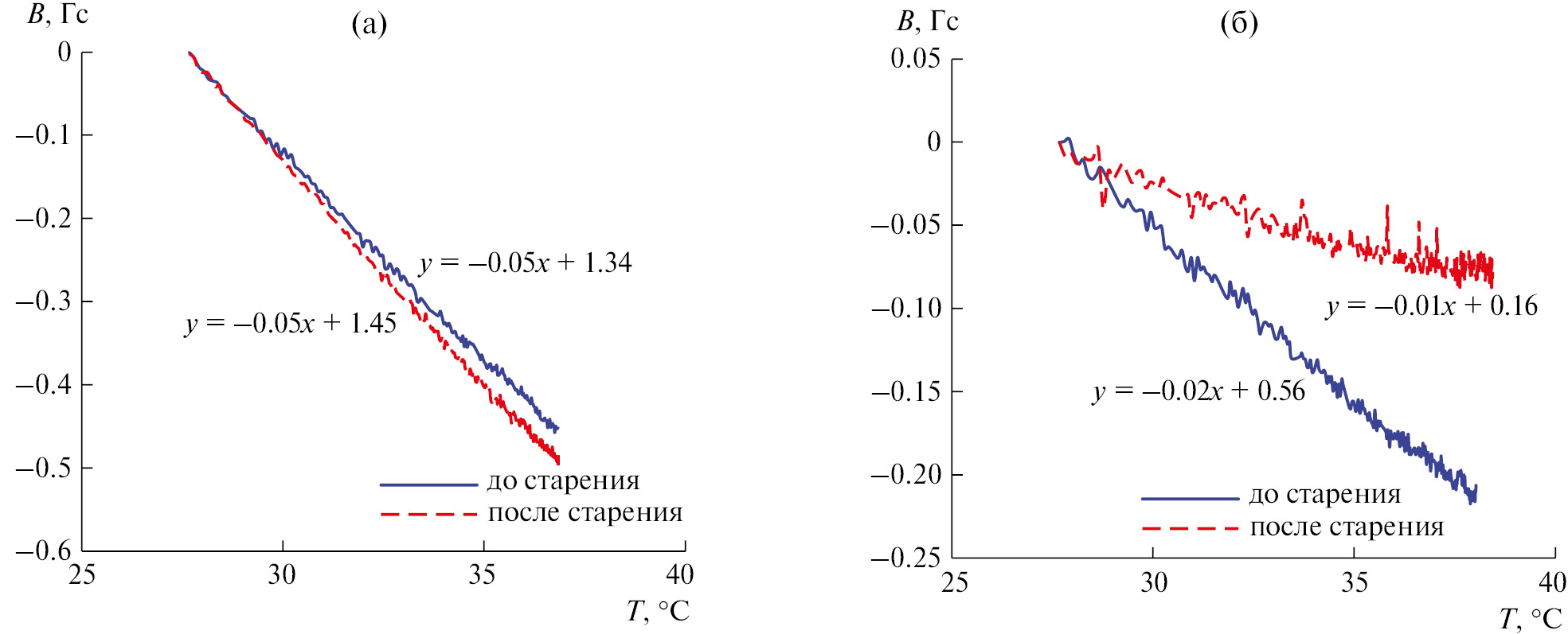 Рис. 7. Зависимость показаний датчиков Холла, расположенных в магнитном экране, от температуры: а — третий датчик, б — седьмой датчик.