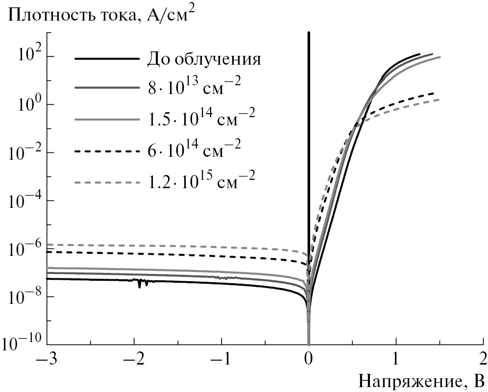Радиационная обработка является одним из важных технологических этапов в производстве полупроводниковых приборов. Радиационная обработка позволяет оптимизировать такие важные характеристики, как рабочая частота, скорость релаксации фототока и время восстановления обратного тока [1]. В устройствах на базе непрямозонных полупроводников, вроде монокристаллического кремния, основным механизмом рекомбинации является рекомбинация по механизму Шоккли–Рида–Холла, которая линейно зависит от концентрации рекомбинационных центров. При облучении высокоэнергетическими частицами создаются дополнительные дефекты, которые уменьшают время жизни неравновесных носителей заряда и тем самым повышают скорость переключения устройств. На этом принципе основана радиационная обработка СВЧ-транзисторов и импульсных диодов [2–4]. При этом облучение неизбежно ухудшает другие рабочие характеристики устройств. Например, для выпрямительных диодов величина последовательного сопротивления в прямом включении должна быть как можно меньше, чтобы вклад омической составляющей базовых областей несильно менял падение напряжения. Облучение существенно увеличивает концентрацию дефектов, уменьшая подвижность носителей и зачастую компенсируя часть электрически активной примеси. Таким образом, последовательное сопротивление возрастает, что отрицательно сказывается на рабочих характеристиках выпрямительного диода [5]. Поиск баланса между положительными и отрицательными сторонами данной процедуры является важной задачей в технологическом процессе производства полупроводниковых приборов.