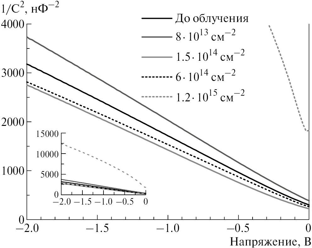 На рис. 3 приведены вольт-фарадные характеристики для различных образцов. Измерения проводились при переменном напряжении 0.1 В. Искажения, вызванные облучением с Ф = 1.2 · 1015 см–2, очень велики. Кривая, соответствующая данному образцу, приведена на врезке.