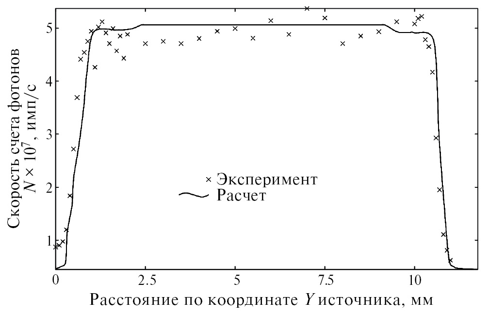 В третьем численном эксперименте были проведены расчеты скорости счета на выходе счетчика фотонов при сканировании зондом вдоль поверхности источника по одной координате (Y) при фиксированном расстоянии до зонда (2 мм). На рис. 6 представлены результаты такого расчета (сплошная кривая). Поскольку радиационный выход с поверхности источника полагался равномерным, расчетная кривая представляет собой практически симметричную “ступеньку”, повторяющую форму источника по одной из координат.