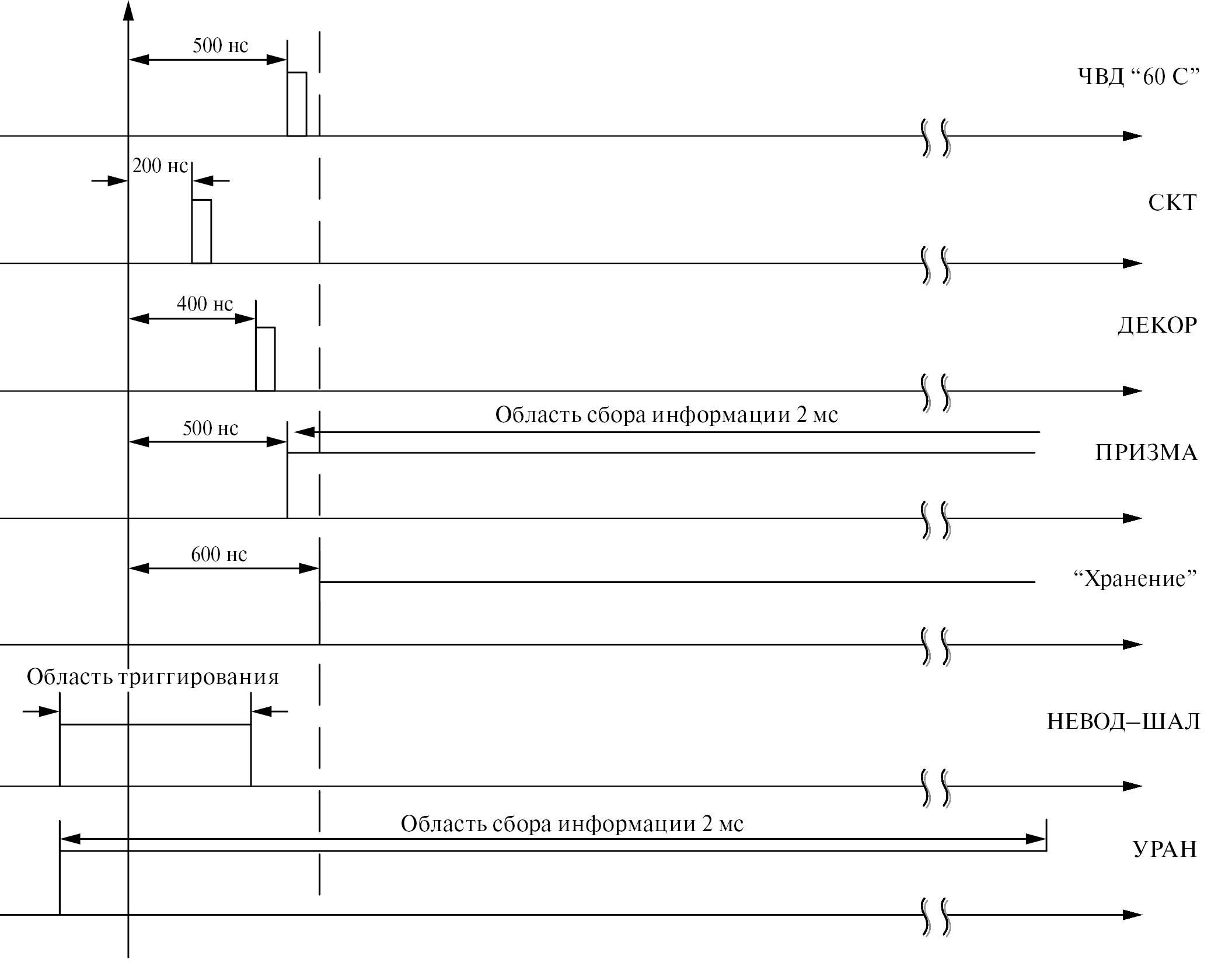 На рис. 7 показано, насколько различается время, необходимое для первичного анализа события, по данным установок комплекса. Самой быстродействующей является система калибровочных телескопов, ее триггерный блок собирает сигналы и вырабатывает триггер в течение 200 нс, поэтому в блок ЧВД он идет через линию задержки. Время выработки триггерного условия на установке ДЕКОР составляет около 400 нс, несколько позже выполняются триггерные условия на установках ЧВД и ПРИЗМА-32. Кластеры установок НЕВОД–ШАЛ и УРАН имеют область триггирования около 400 нс, однако выработанный этими установками локальный триггер любого кластера не может служить меткой для триггерной системы (ТС) установки НЕВОД, так как он нестабилен во времени. В зависимости от конфигурации регистрируемого ШАЛ время срабатывания кластеров варьируется на несколько микросекунд.