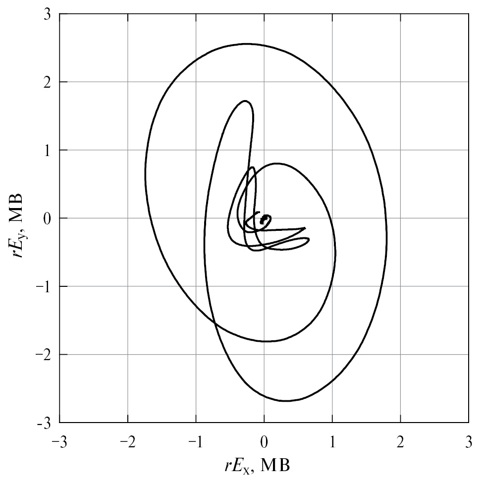 Рис. 10. Годограф вектора напряженности электрического поля в главном направлении излучения на расстоянии r = 10.36 м от решетки спиральных антенн.