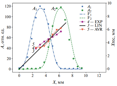 Рис. 2. Зависимость измеренных амплитуд сигналов A1 и A2, от положения светового луча. Кривые F1 и F2 получены в результате процедуры аппроксимации измеренных данных A1 и A2, зависимостями (1) F1(Xp) и F2(Xp). Правая вертикальная ось Xrec используется для отображения зависимости реконструированной координаты светового потока от реального положения потока для двух алгоритмов реконструкции (AVR, EXP). Прямая линия (LIN) соответсвует Xrec = X.
