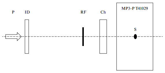 Рис. 3. Схема расположения детекторов (ID, RF, Ch) на пучке протонов (P) с энергией 160 МэВ, протоны останавливаются в водном фантоме MP3-P в области S.