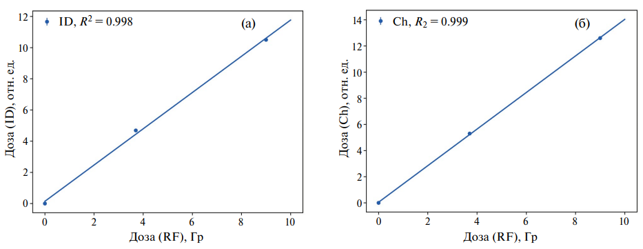 Рис. 4. а – График зависимости измерений суммарной дозы импульсным датчиком тока ID от дозы пленочного детектора RF; б – график зависимости измерений суммарной дозы в мониторе Ch от дозы пленочного детектора RF. Результаты аппроксимации измерений линейной зависимостью показаны прямой линией.