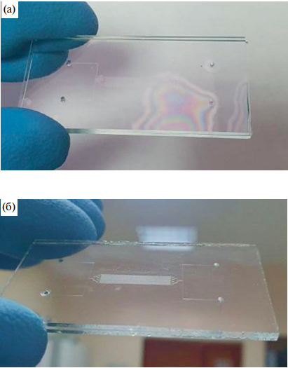 Рис. 3. Микрофлюидный чип с дефектом склейки (а), без дефектов (б).