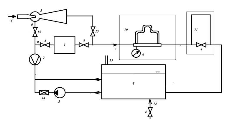 Рис. 3. Схема экспериментального стенда, предназначенного для изучения поведения двухфазных сред: 1 — паровой котел, 2 — расходомер, 3 — насос; 4, 15 — клапаны, 5 — эжектор, 6 — воздух, 7 — двухфазная смесь, 8 — расходный бак, 9 — манометр, 10 — участок определения потерь напора, 11 — участок наблюдения, 12 — подача/слив воды, 13 — воздушная трубка, 14 — регулирующий подачу клапан (дроссельный).