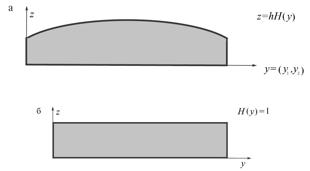 Рис. 1. Поперечные сечения пластин переменной (а) и постоянной толщины (б).