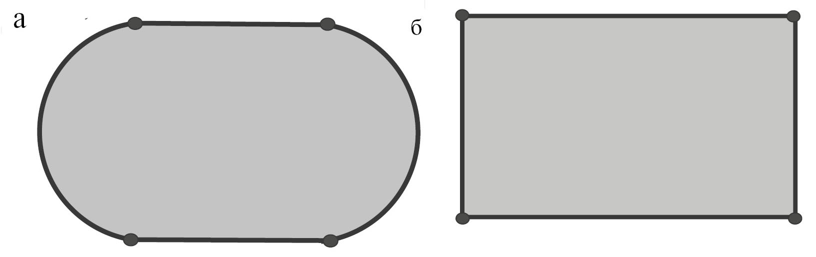 Рис. 4. Составной контур — пара полуокружностей и пара прямых отрезков (а). Угловые точки на контуре (б), точки скачков кривизны контура (а) указаны меткой ●.