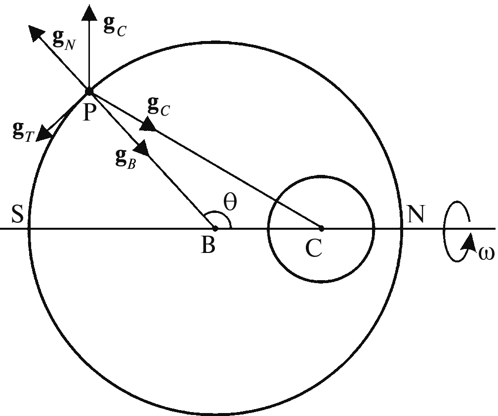 Рассмотрим твердое тело , получающееся изъятием содержимого сферической полости с центром C радиуса с поверхностью из однородного шара с центром B радиуса с поверхностью и последующим заполнением этой полости однородной средой, плотность которой в общем случае отличается от плотности шара , равной . Предположим, что тело совершает вращение вокруг своей оси симметрии с постоянной угловой скоростью ɷ, а по его поверхности движется частичка P. Ее движение осуществляется под действием силы притяжения со стороны тела , а также реакции со стороны поверхности тела, имеющей нормальную составляющую, препятствующую проникновению под поверхность тела, и касательную составляющую, представленную силой сухого трения. В дальнейшем предполагается, что частичка пренебрежимо мала по сравнению с телом и не оказывает влияния на его движение.