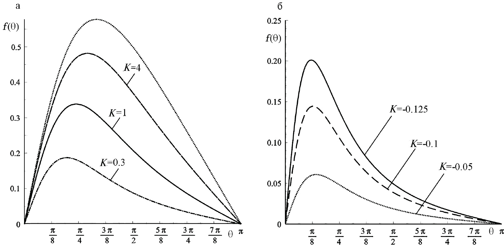 Пусть теперь плотность СВ меньше плотности тела, т. е. . При фиксированном расстоянии между центрами шара и СВ d = 0.5 и различных отрицательных значениях параметра K графики функции изображены на рис. 2, б (ср. рис. 2 из [18]). Как и в случае положительных K, при поверхность целиком заполнена равновесиями, а если , то существует “пояс” без равновесий, разделяющий приполярные области, заполненные равновесиями.