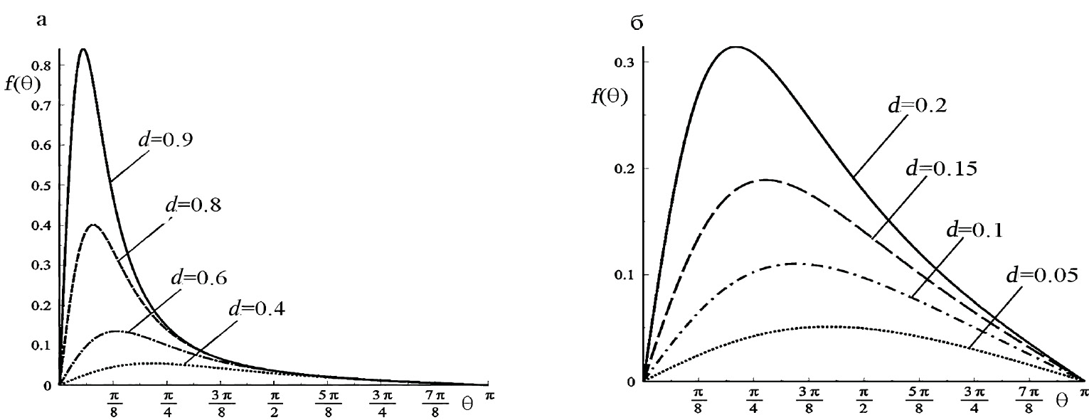 3.2. Зависимость от d. Функция также зависит от параметра d. На рис. 3, а изображены примеры графика функции при положительном значении “дополнительной массы” (параметр K = 0.1), а на рис. 3, б – при ее отрицательном значении (параметр K = –0.5) и различных значениях расстояния d между центром шара и центром включения. Отметим, что в случае величина d ограничена сверху значением . Можно видеть, что в обоих случаях максимальное значение , достигаемое функцией f на периоде, растет с увеличением расстояния d. При равновесиями заполнена вся ограничивающая шар сферическая поверхность, а при на сфере имеется разделяющий приполярные области равновесий “пояс”, на котором равновесий нет.