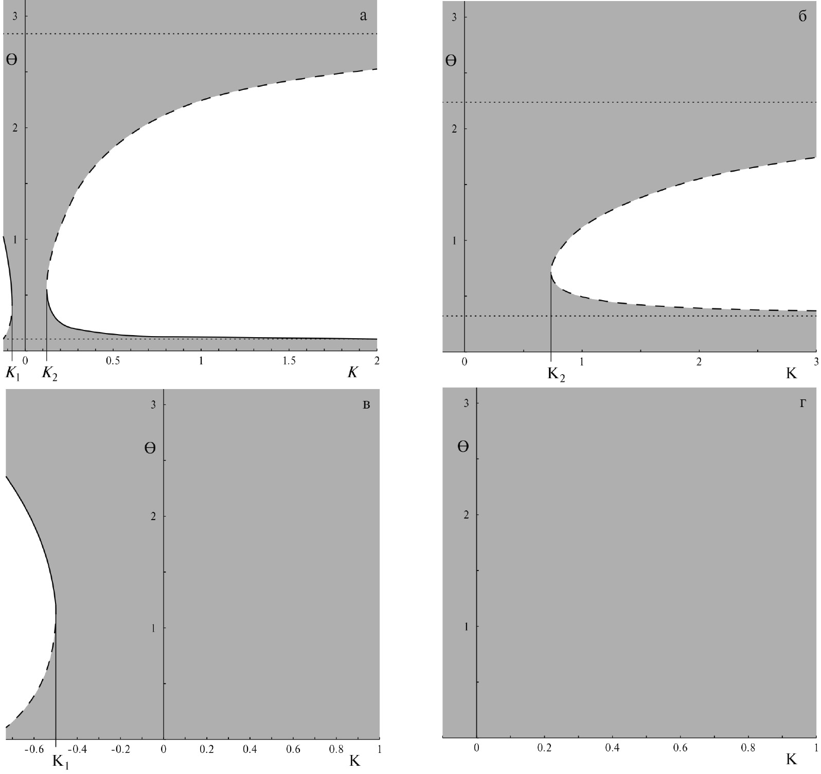т.е. δ < 1, и у уравнения (3.6) имеется корень θ = θ1, которому отвечает значение K = K1, при этом . Пара (θ1, K1) на плоскости (θ, K) задает точку бифуркации, принадлежащую кривой Г_. Кроме того, у уравнения (3.7) имеется корень θ = θ2, ему отвечает значение K = K2. Пара (θ2, K2) на плоскости (θ, K) задает точку бифуркации, принадлежащую кривой Г+. Для d = 0.5 и такая ситуация изображена на рис. 4, а. Здесь и далее на рисунках области, на которых выполнено неравенство (2.6), выделены темно-серым цветом.