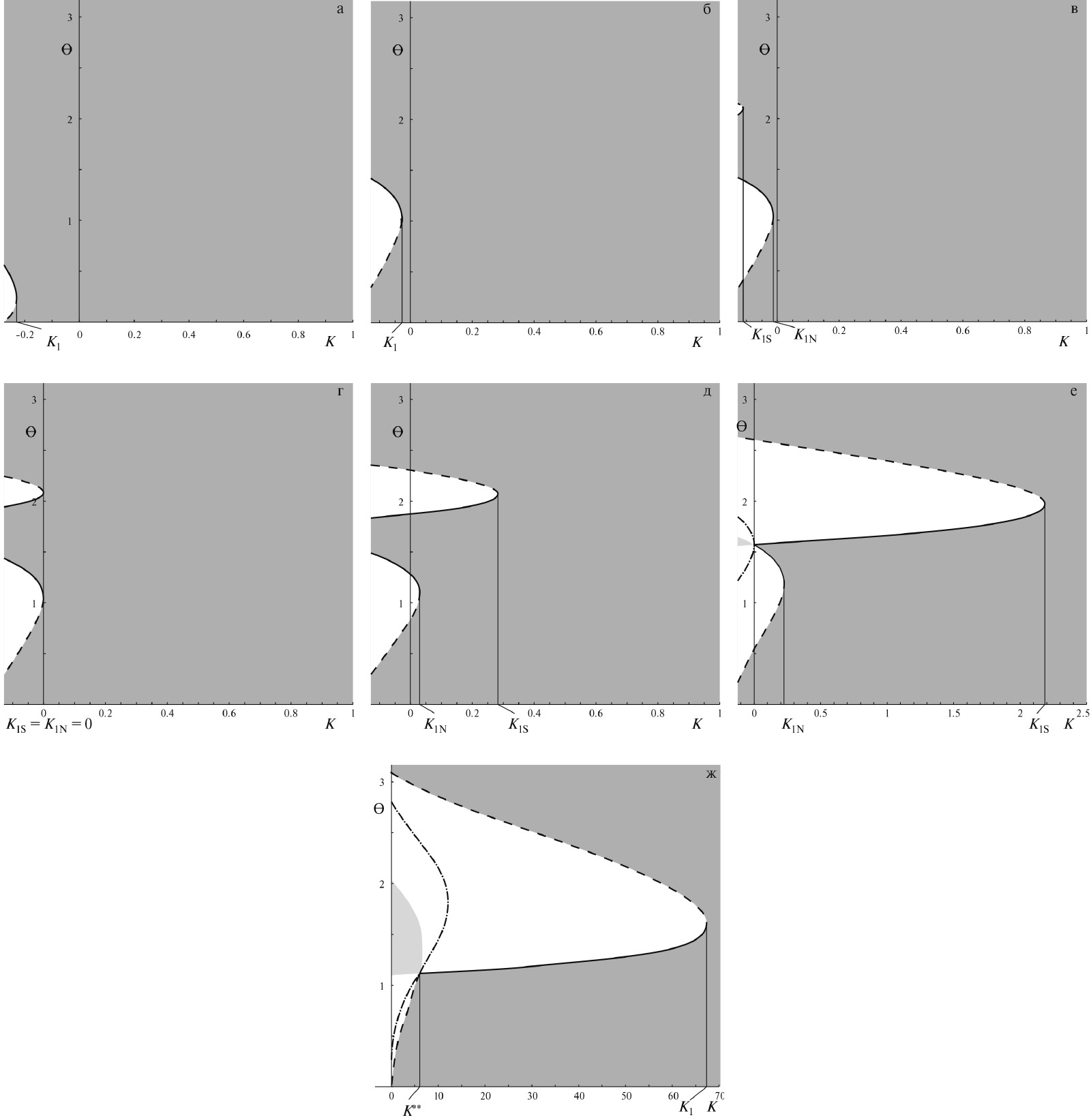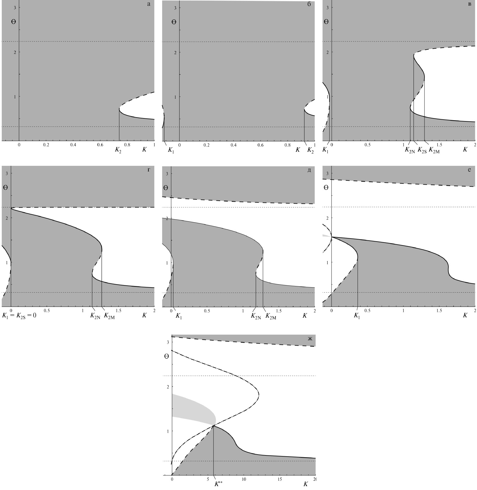Замечание 7. Бифуркационная диаграмма, построенная для случая и корня уравнения (3.6), отвечающему значению такому, что (рис. 4, в) будет изменяться по схеме, схожей с изображенной на рис. 6, б–ж.