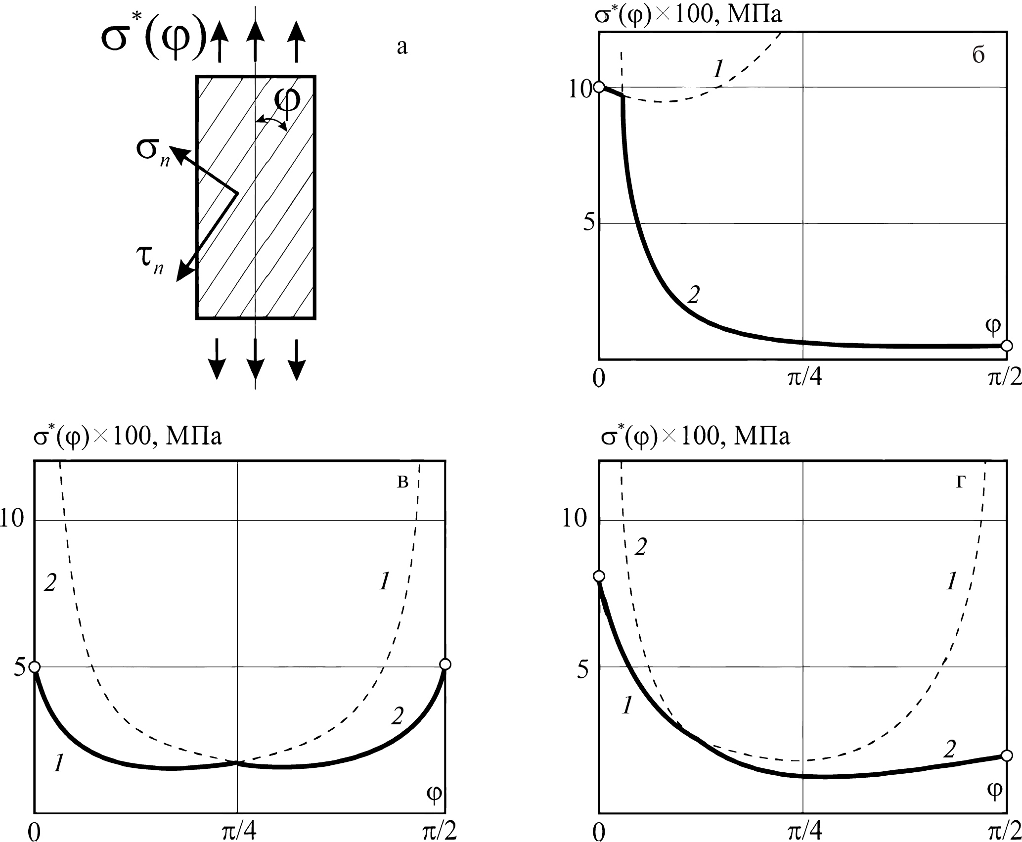Применительно к представленным на рис. 1 предельным поверхностям легко вывести, например, зависимость критического напряжения от угла между направлением растяжения и направлением укладки волокон (ось 1). Проекции “вектора” нагружения в координатах выражаются в виде: