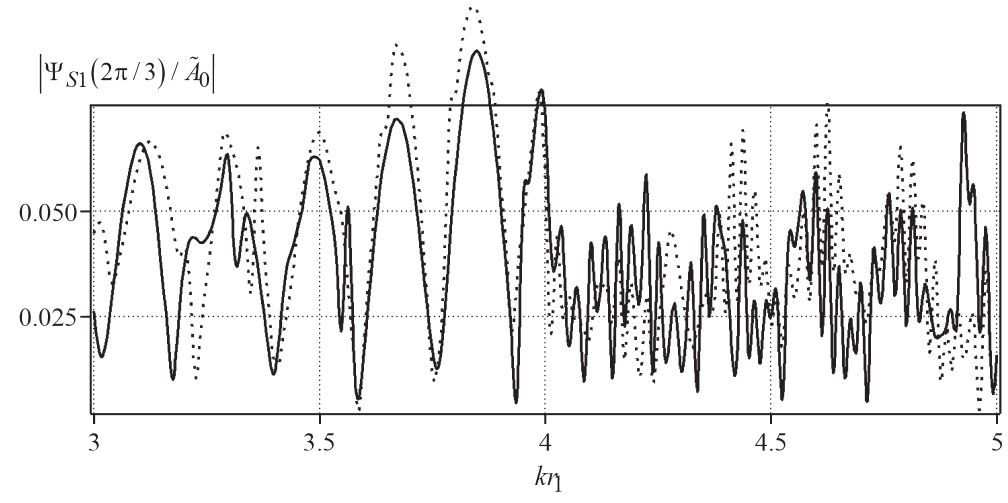 - Численные исследования. На основе полученного решения были проведены расчеты зависимости безразмерной амплитуды рассеянного поля от угловой координаты и зависимости коэффициента обратного звукового рассеяния от волнового размера тела в плоскости при . В этом случае интегралы из (3.24) принимают вид